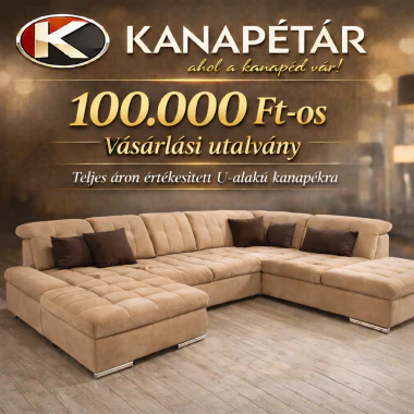 Vásárlási utalvány U-alakú kanapé vásárlása esetén, amelyet a Kanapétár ajánlott fel. A nyeremény személyesen beváltható a 1047 Budapest, Baross utca 75-77. I. emelte található bemutatóteremben. A kedvezmény az akciós kárpitos bútorokra nem vonatkozik. Az utalvány névre szóló, nem átruházható és 2026. május 31-ig használható fel. Tekintse meg kínálatunkat a weboldalon, vagy látogasson el a kiállításon az 53-as standra, ahol egyedi kedvezményekkel várjuk.