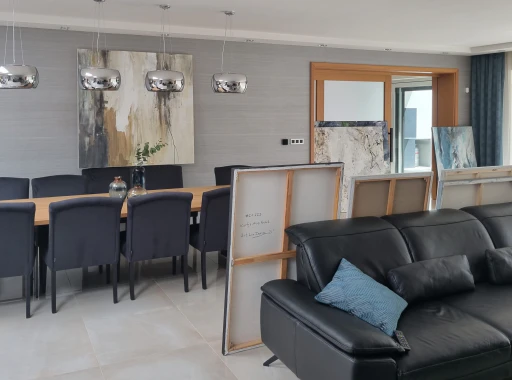 Az Artliz Design absztrakt festményei a személyes terek harmóniáját és egyediségét hivatottak megteremteni. A privát otthonokba megálmodott alkotások a megrendelő stílusához, életérzéséhez és enteriőrjéhez igazodva születnek meg, így nem csupán dekorációként, hanem a tér szerves részeként vannak jelen. A színek, textúrák és rétegzett felületek tudatos alkalmazása nyugalmat, inspirációt vagy éppen lendületet visz a nappalikba, hálószobákba és közösségi terekbe. Szolgáltatásunk komplex megoldást kínál: az alkotás kiválasztásától vagy megtervezésétől kezdve segítek a megfelelő méret és színvilág meghatározásában, igény esetén a keretezésben, valamint a szállításban és a szakszerű rögzítésben is. Választhat azonnal elérhető, készleten lévő festmények közül, vagy kérhet teljesen egyedi, személyre szabott alkotást, amely kifejezetten az Ön otthonához készül. Ne nézze tovább az üres falakat – teremtsünk együtt karakteres, stílusos és harmonikus enteriőrt, amely valóban Önt tükrözi. Látogasson el az 51/F standhoz vagy nézzen körbe az artlizdesign.hu honlapon." Enteriőr fotó több festménnyel