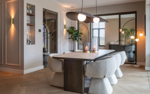 Ez az enteriőr a mediterrán nyugalom esszenciáját ragadja meg, ahol a ritkaságnak számító teakfából készült bútorok természetes erezete és mélysége adja a tér lelkét. A masszív, mégis elegáns teakfa asztal és székek időtálló karaktere harmonikusan kapcsolódik a természetes fényhez, a gazdag textúrákhoz és a visszafogott színvilághoz.