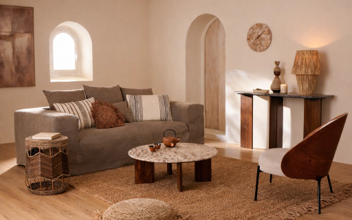 A Lone fotel ívelt formájával és természetes tónusaival visszafogott eleganciát hoz a térbe, míg a Beach kanapé letisztult arányaival és puha, természetes hatású kárpitozásával a mediterrán életérzés nyugodt központja. A raffia párnák kézműves textúrái meleg, természetközeli réteget adnak, a Terra juta szőnyeg földszínű, természetes szálai pedig stabil, rusztikus alapot teremtenek az enteriőrben.