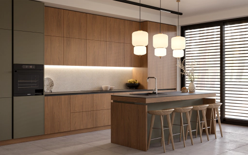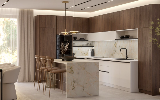 Konyhabútor-kínálatunkban a modern, prémium megoldások dominálnak, minden esetben ügyfélre szabva. A fotón egy olyan stílus látható, amelyben a fa, a kőhatás és a minimalizmus érvényesül. Konyháinkat egyedileg tervezzük akár szigettel, akár rejtett tárolókkal. A fotórealisztikus látványterv része a folyamatnak, amely bemutatja az adott térbe illeszkedést.