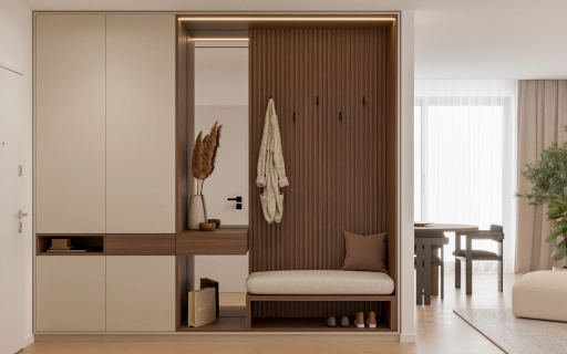 Az előszobák kialakításánál arra törekszünk, hogy a modern megjelenés és a funkcionalitás egyszerre legyen jelen már a belépés pillanatában. A bemutatott enteriőr csak egy példa arra, hogyan ötvözhető a meleg faerezet, a lamellás falburkolat és a rejtett világítás egy harmonikus, rendezett előtérben. Előszobabútorainkat mindig az adott helyiség méreteihez és tárolási igényeihez igazítjuk. Az elemek – ülőfelület, cipőtároló, polcok, akasztós részek vagy tükör – variálhatók, így teljesen személyre szabott konfiguráció készülhet. A tervezési folyamatot látványtervek támogatják a végső összhatás megmutatásához.