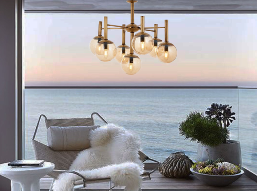 Szigethy Design - Kortárs üvegművész által kézimunkával kiegészített hagyományos gyártástechnológiával készített mennyezeti csillár. A csillár anyaga réz, az üveg búrák arany füsttel felületkezeltek.