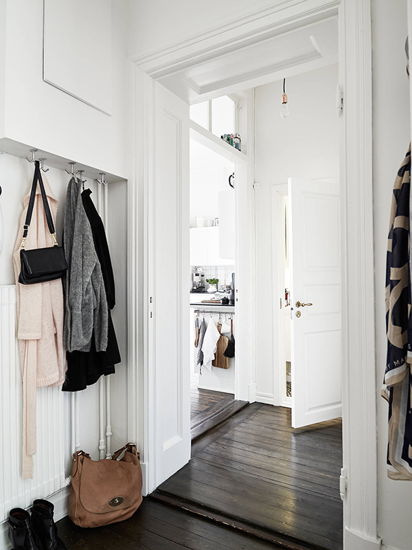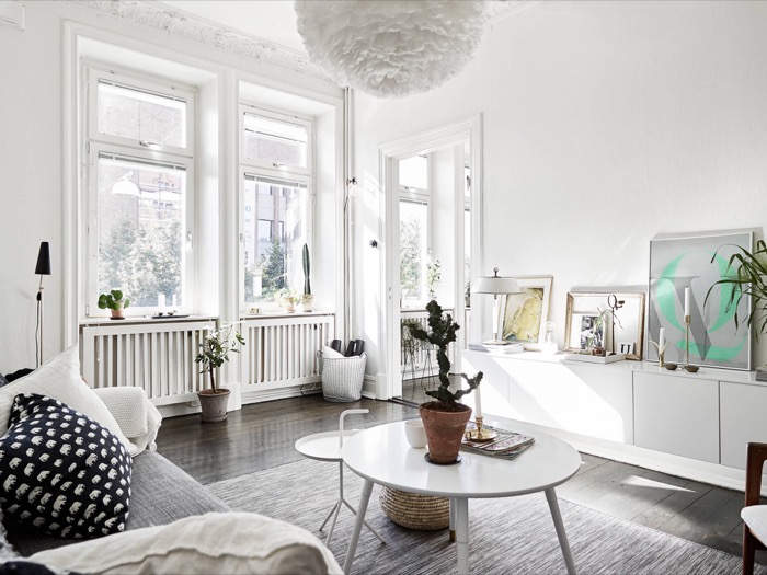 Ez a skandináv lakás monokróm színű berendezést kapott, és pont az ilyen kontrasztok miatt lett rendkívül bájos is. A hatalmas belmagasságot a fehér mennyezet és a sötét fapadló még jobban kiemeli; a nagy ablakok pedig az összes napfényt beengedik, így a lakás légies, családias és otthonos lesz. Az egyéb kiegészítő tárgyak a nyitott terek érzetét támogatják pozitívan, ilyen például a nagy nyitott polcos könyvesszekrény is. A monokróm hangulat még az erkélyen is folytatódik, ahol az egészet egy hangulatos gömbizzó sorral koronáznak meg, mely este felkapcsolva melegséggel tölti meg a lakást.