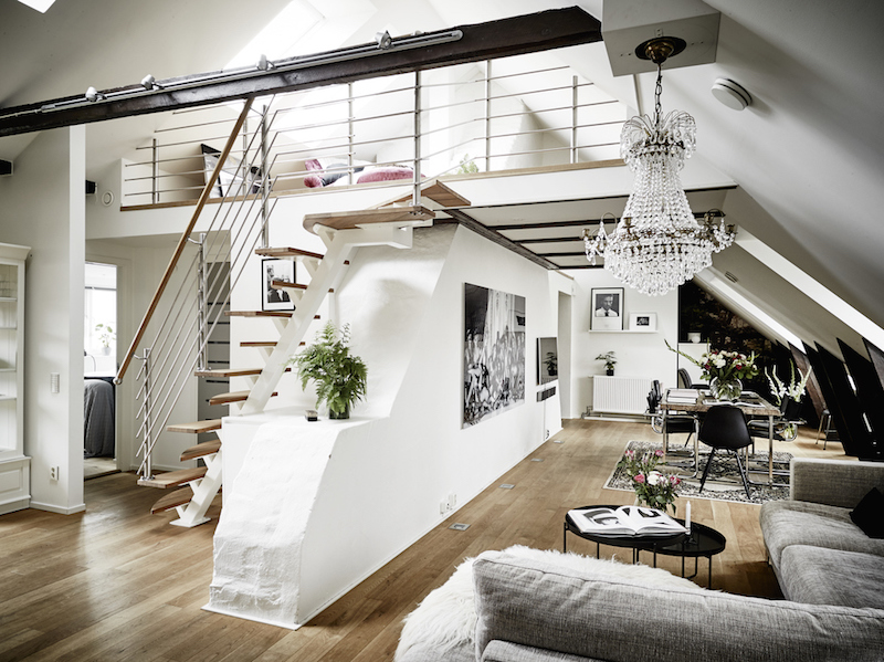 Svédországban található ez a különleges adottságokkal rendelkező lakás. A kialakításánál igyekeztek előnyt kovácsolni minden olyan adottságából, amin nem lehetett változtatni. A lakást ketté szelő főfalat, és a gerendázatot is meghagyták. A stílusos csillár pompát csempész a terekbe, a design székek pedig lazaságot. Érdemes körbenézni!
