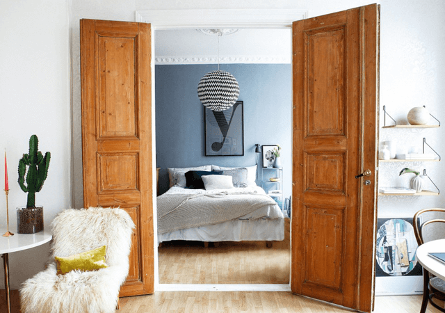 Ez az Oslo-ban lévő kis lakás hasonló adottságokkal rendelkezik mint egy budapesti régi bérlakás: nagy belmagasság, karakteres, szép ajtók és ablak keretek. A tulajdonos mennyezeti stukkót és díszlécet használt a falaknál, a hálószoba és nappali közötti ajtó esetében kezeletenül hagyta a faajtót, amihez gyönyörűen passszol az acélkékre festett fal. Szépen keverte a lakásban a modern, a vintage és antik bútorokat, aminek az eredménye egy egyszerű és kényelmes kis otthon skandináv eklektikus stílusban.