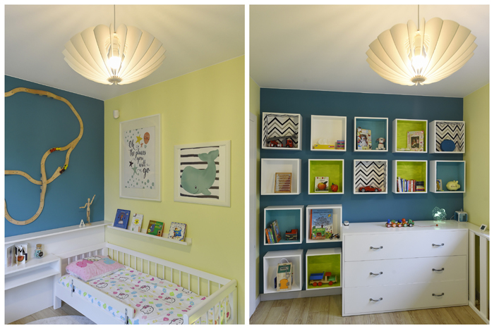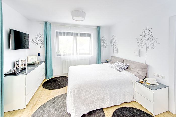 Marosvásárhelyen található ez a fehér és élénk, játékos színekre komponált kétszintes családi otthon. A semleges alapokat, a világos fapadlót és a fehér falakat, bútort, tökéletesen ellensúlyozza a vidám sárga fotel, a pink kanapé, a türkizkék könyvespolc. A gyerekeknek kialakított külön játszószoba és kisméretű gyerekszoba szintén ötletes megoldásokat tartalmaz: falra dekorációnak felszerelt fa vasúti sínek, fekete táblafestékkel festett fal és pöttyözött mennyezet, a szoba színeit ismétlő festett polcbelsők. Bátor a színválasztás, de az összhatás mégsem diszharmónia, hanem egy fiatalos és modern tér.