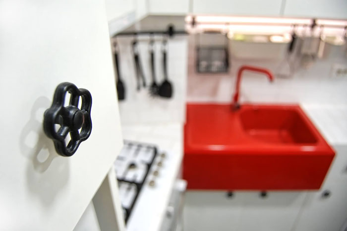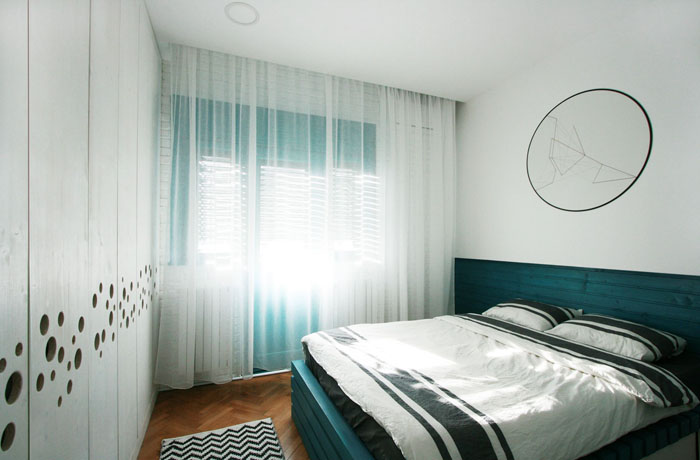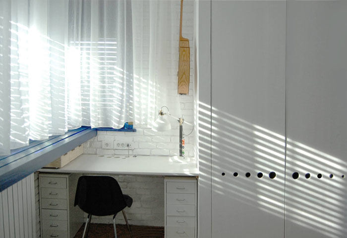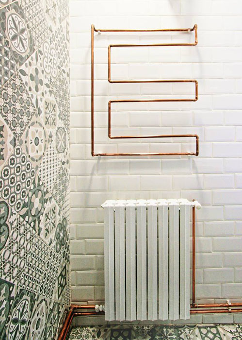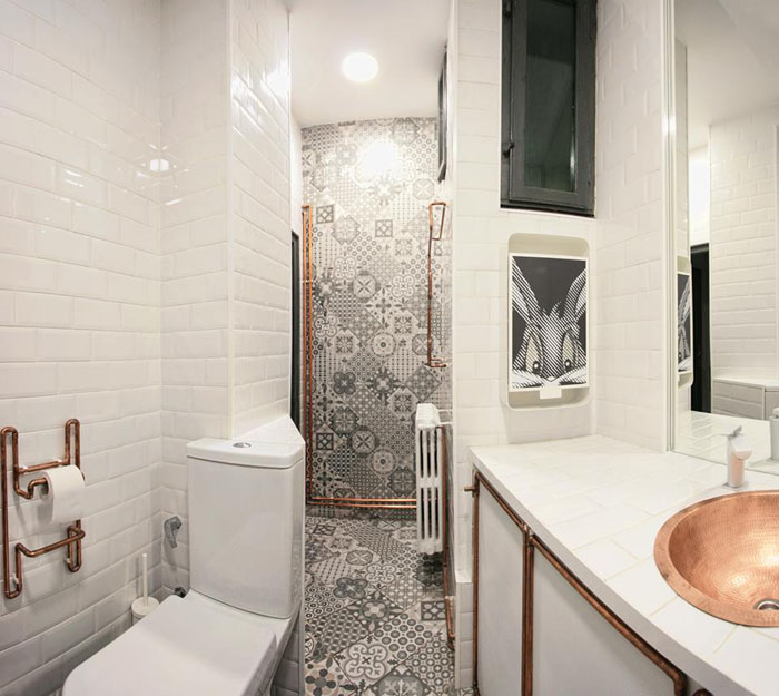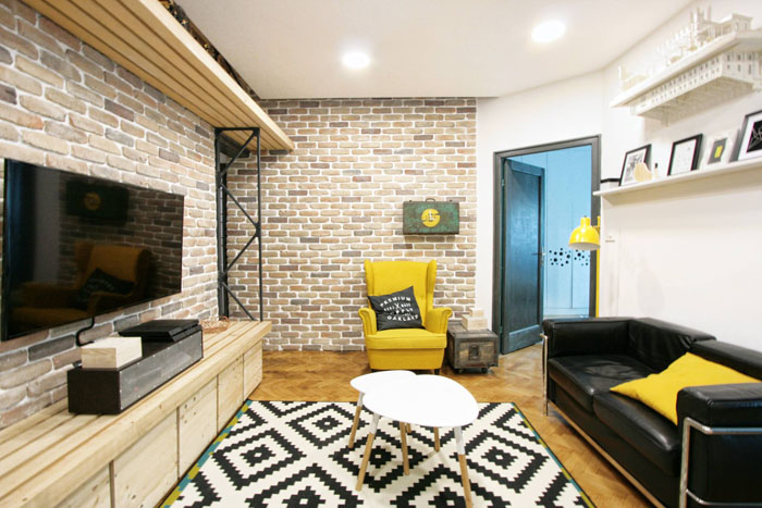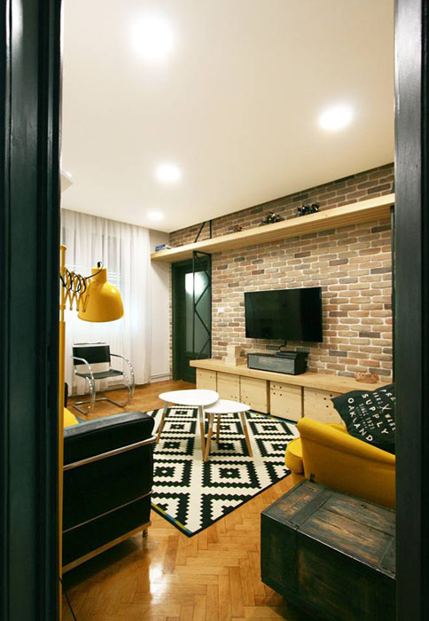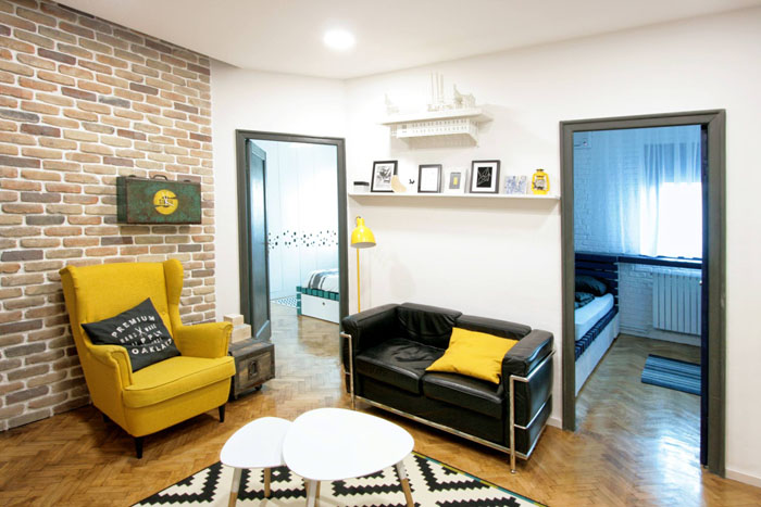 A modern ipari stílus már Romániában is egyre inkább trendnek számít, mint ahogy az itt bemutatásra kerülő bukaresti lakásban is látszik. Az itt-ott megjelenő ipari elemek, mint a réz mosdótál, rézcsőből készült tárgyak, látszó illetve fehérre festett téglafal mellett modern és trendi bútordarabokat és lámpákat találunk a lakásban. Az alapvetően fekete-fehér színvilágú, férfias otthont erőteljes színek melegítik, mint a sárga fotel vagy piros mosogató. Egyszerű, de karakteres lakás.
