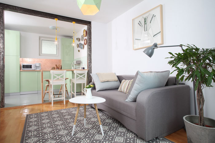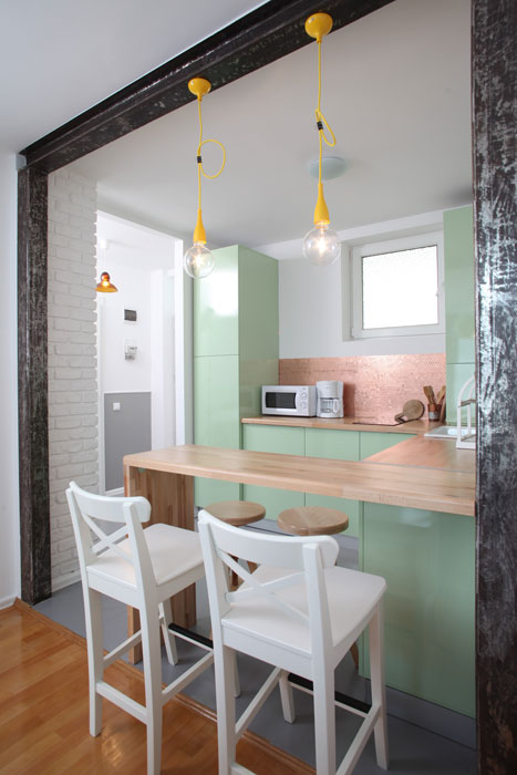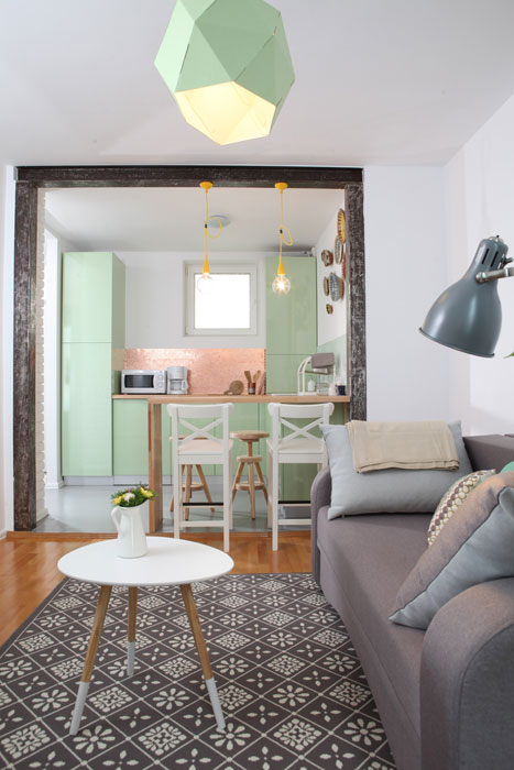 40 négyzetméteres, két szobás kislakás Bukarest történelmi központjában, amelyet egy fiatal egyetemista lány igényei alapján újítottak fel. A világos menta zöld és szürke finom árnyalataira komponált lakás stílusa modern, skandináv hangulattal, de a gyökereket idéző elemek ugyanúgy megtalálhatóak benne: kerámia tányérok, köztük Korondi tányér is, mint fali dekoráció, szőnyeg népművészeti motívumokkal, faláda. Ötletes megoldások frissítik a lakás stílusát, pénzérméből készült konyhai hátfal, fürdőszobai pultra ültetetett zománctál, hajókötél és sárga textilkábellel készült függesztékek. Egyszerű, de kényelmes, fiatalos otthon.