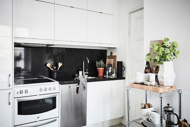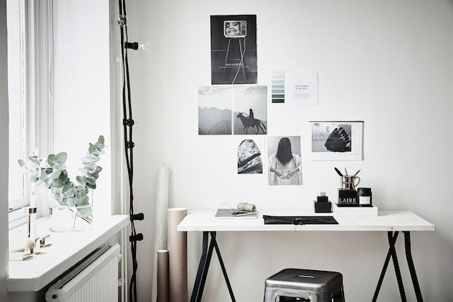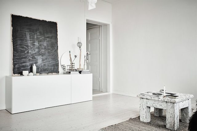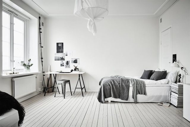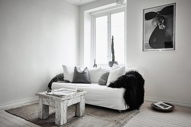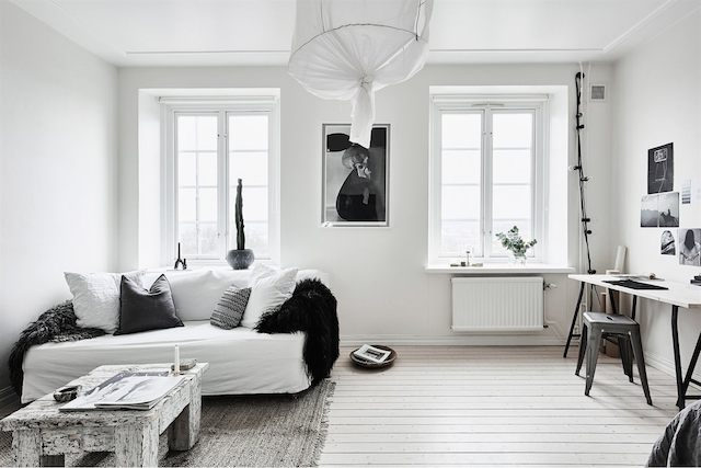 Nem könnyű 35 nm-en tágas érzetű életteret kialakítani. A svédeknek itt sikerült! A titok: kevés bútor (abból is kisebb méretű), hófehér falak és padló, nem túlzsúfolt falak, jól meghatározott fókuszpontok (pácolt fatábla pl.). Színek tekintetében a fehér-szürke-fekete skálán mozognak a berendezési tárgyak. Egyszerű, de nagyszerű, élhető kislakás!