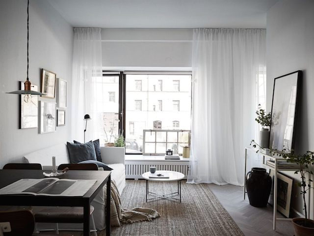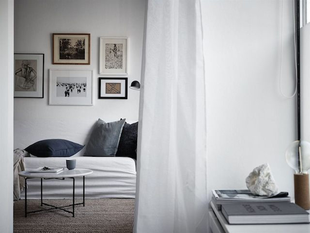 Bátran használta a tervező a sötét színeket kis otthonában, mely mindössze 32 m2. A hálót a nappalitól egy pengefal és függöny választja el. A konyha kicsi, de minden igényt kielégít. A jó tértervezésnek köszönhetően élhető, kényelmes terek születtek. A színek egységet teremtenek a helyiségek között, és karakteressé teszik ezt a kis lakást.