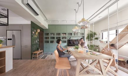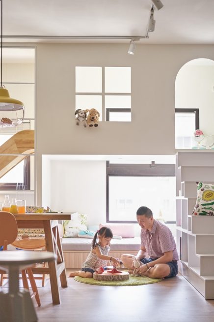 Kisgyermekes családok számára sokszor az a legnagyobb kihívás, hogyan alakítsák ki otthonukat olyan módon, hogy belső terek stílusosak legyenek, ugyanakkor a kis lurkók is jól érezzék magukat. Ebben a 136 négyzetméteres taiwani lakásban a szülők a HAO Design belsőépítészei segítségével tökéletesen megtalálták az egyensúlyt. A 60 négyzetméteres egy légterű nappali zónában tartózkodik legtöbbet a család, ezt világos színekkel, világos fa felületekkel és egyedi bútormegoldásokkal tették praktikussá és kényelmessé: táblafestékkel festett beépített előszoba szekrény, skandináv módra, több funkciót ellátó hatalmas étkezőasztal, pihenőágy-játékkuckó csúszdával, melyre a lépcsőzetesen kialakított könyves szekrény polcain lehet feljutni. Az itt használt ötleteket valóban érdemes ellesni!