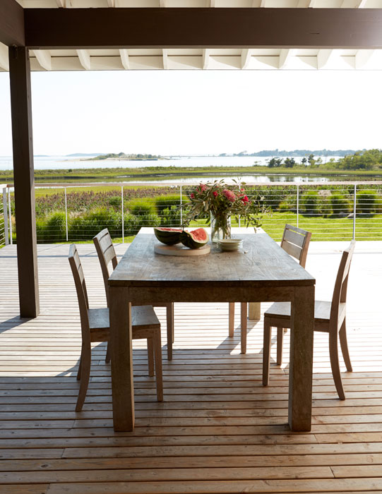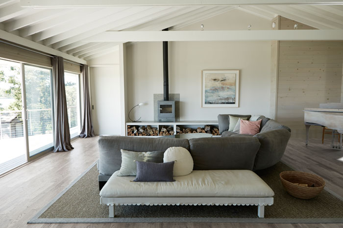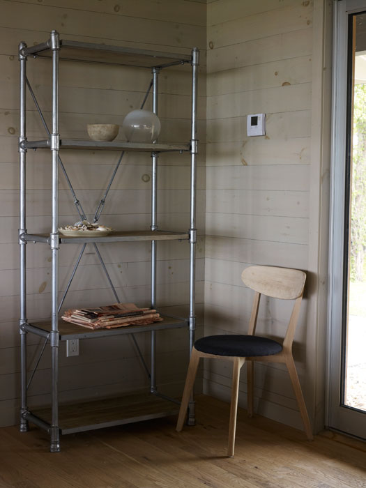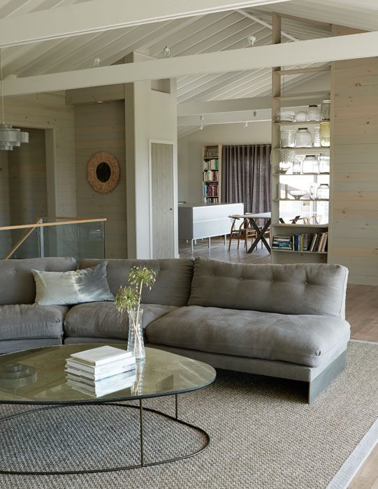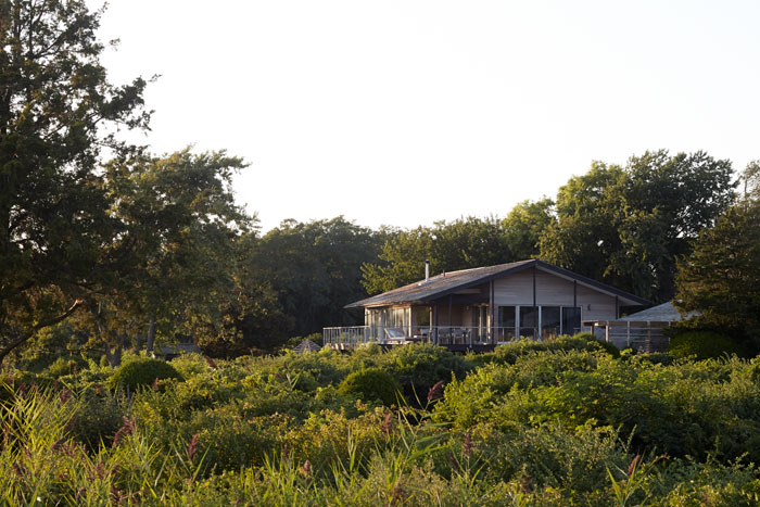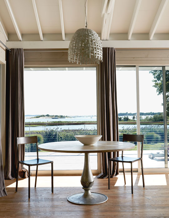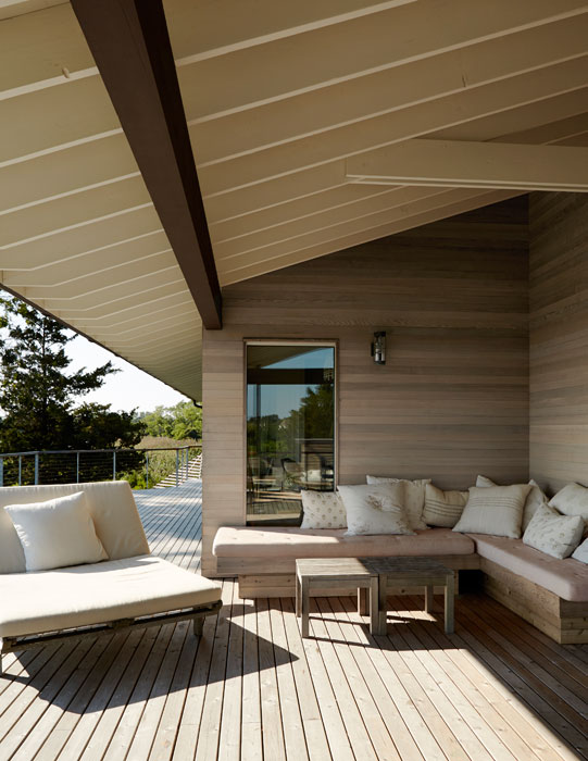 Ebben a Shelter-szigeten lévő békés és nyugodt hangulatú nyaralóban, Észak-Amerika keleti partvidékéről származó lakberendezési irányvonal, a tengerparti stílus elemeit találjuk meg. Visszafogott színei: homokszín és világosszürke, a rengeteg természetes anyag használata és a nagy ablak felületek világos, tiszta érzetet adnak a nyaraló belső tereinek. A fordított térszervezés: a földszinten található 5 hálószoba és az első emeleten kialakított nappali zóna a panorámás terasszal, segíti és kellemesé teszi a család számára az együtt töltött perceket, biztosítja a nyugodt pihenést.