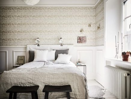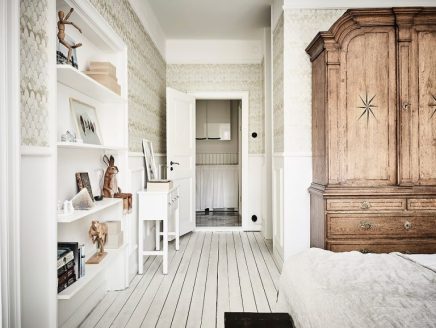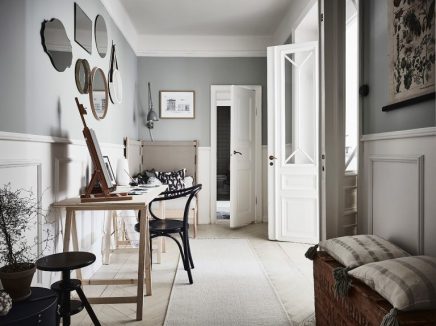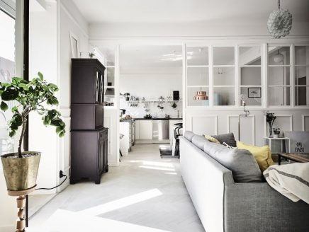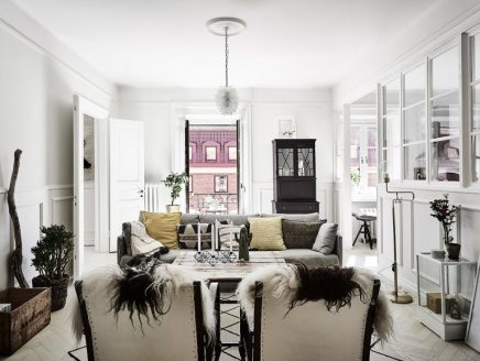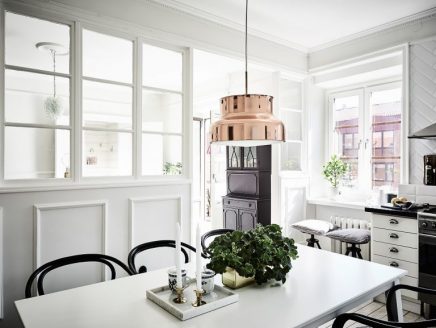 Svédországban található ez a 87 négyzetméteres, skandináv stílusú otthon, amelynek karakteres fókuszpontja a nappalit és a konyha-étkezőt elválasztó, üvegbetétes, fehérre festett térelválasztó. Ez a megoldás azoknak lehet kitűnő választás, akik nem kedvelik a teljesen egybe nyitott nappali zónát. A lakás jellemzői elemei a sok fehér és monokróm árnyalat, a szép halszálka mintás parketta vagy a fehér svéd padló, a kényelmes, elegáns, néhol rusztikus hangulatú bútor, ipari lámpa. Ilyen egy igazi otthon Északról!