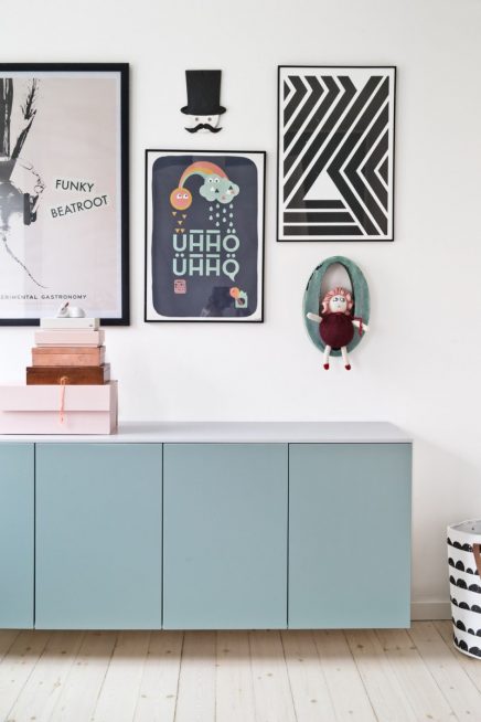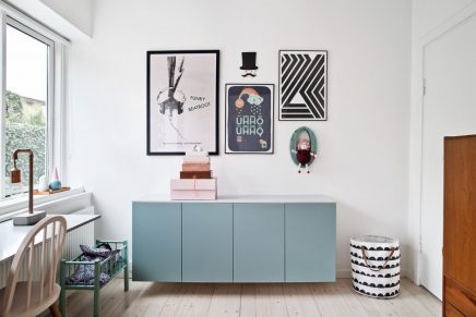 Egy dán enteriőr tervező kislányának 12 négyzetméteres szobájáról készült képek láthatóak a következő blog posztban. A 6 éves kislánynak a szobája praktikusan lett kialakítva, megfelelően egy olyan több funkciós térnek, ahol a gyerek alszik, játszik, tanul. A szoba világos érzetű köszönhetően a fehérített fapadlónak, a fehér falaknak és tároló bútornak, ugyanakkor a kiságy mellett használt semleges kék falszín, púder rózsaszín elemek szépen visszaköszönnek a bútorokon és dekoráción. Az IKEA valamint a felújított, retro stílusú bútorok és ehhez az egyszerű és színben harmonizáló dekorációk meghatározzák a gyerekszoba stílusát és igazán egyedivé varázsolják.