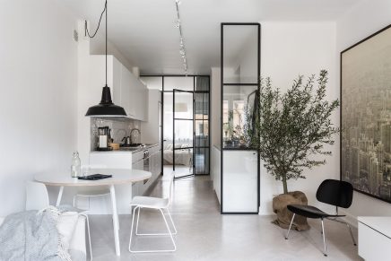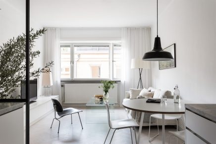 Szokatlan, T betűt formáló alaprajzzal rendelkező, 53 négyzetméteres lakást mutat be ez a blog poszt a skandináv stílus elemeivel és praktikus térszervezéssel. Rengeteg fehér segítségével a lakás ragyogóan világos, még úgyis hogy a konyha "beékelődött" a nappali és hálószoba közé. Szép megoldások sora teszi szinte elegánssá és harmonikussá az otthont, a fehérített halszálka mintás parketta, az üvegezett, fekete acélkeretes térelválasztók, a modern konyhabútor márvány konyhapultja, a hatalmas méretű monokróm színvilágú, feketével keretezett fénykép a falon. Érdemes a lakást bemutató képeket végignézni!