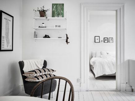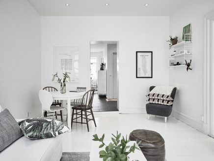 A skandináv országokban gyakran láthatunk teljesen fehérre hangolt otthonokat. Ennek a Linnéstaden városában található 57 négyzetméteres kislakásnak a tulajdonosa szintén a fehér segítségével alakította ragyogó világossá a nappaliját, fehér falak, fehérre festett fapadló, fehér bútorok, mint a kanapé, komód vagy étkezőasztal, melyben a kontrasztot csak a pálcás székek, textilek mintái és dekorációkon megjelenő monokróm árnyalatok adják. Egyszerűen elegáns megoldás, amely szélsőségesen fehér kedvelőknek jó inspiráció!