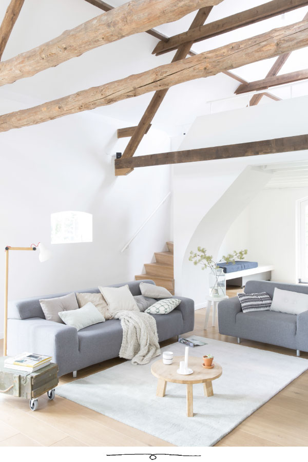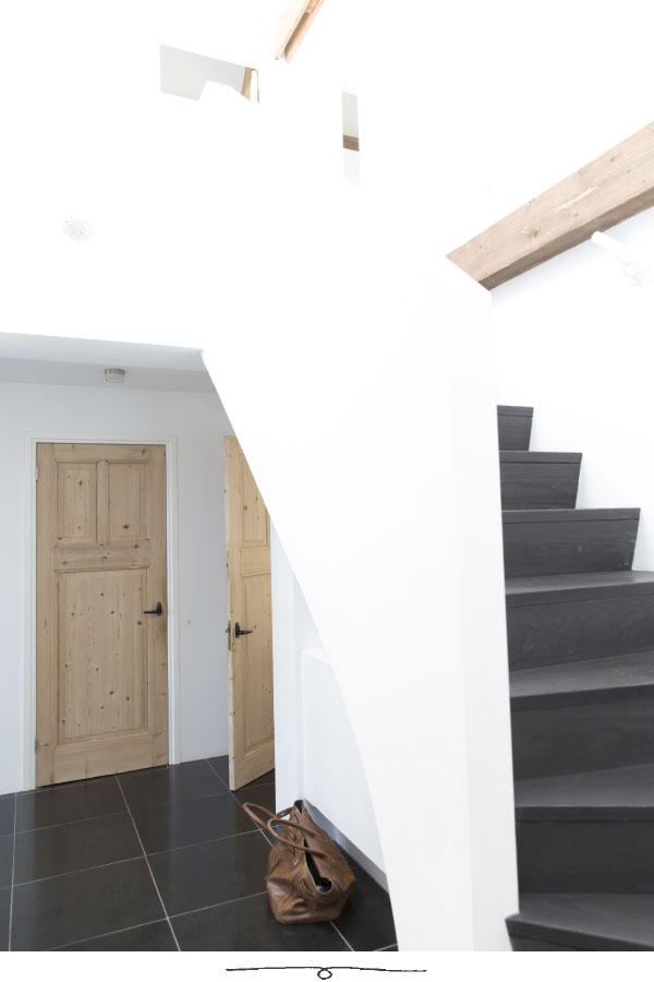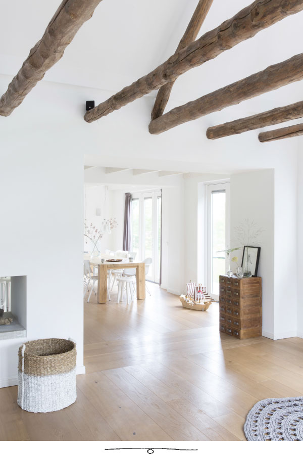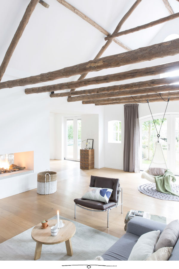 Tipikus holland tanyaház, amelyet tulajdonosai a mai trendnek élhető, modern módon átterveztek és skandináv stílusban újítottak fel. Az alap a sok fehér, amely remekül kiemeli az eredeti, rusztikus fa tetőgerendákat, a világos fa svédpadlót és fa belső nyílászárókat. A sok fa felület alkalmazása, a nagy belmagasság, a pár vintage hangulatú bútor keverve modern bútorokkal és a játékos megoldások, mint a tetőgerendára függesztett hintafotel, a kétoldalú kandalló, amely a konyha és nappali felől is nyitott, a konyhai táblafestékkel kialakított üzenő fal mind megerősítik a lakás otthonos hangulatát, kényelmes és tágas tér érzetét.
