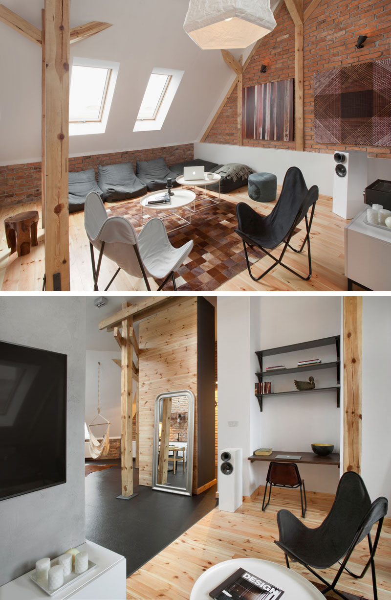 Lengyelország, Poznan városában található ez a CUNS Design által tervezett és felújított loft lakás. A tervezők egy szinte egy légterű és világos, természetes fényben gazdag teret alakítottak ki, köszönhetően a nagy belmagasságnak, a tetőtéri ablakoknak és a megfelelően használt fehér falszíneknek. Az eredeti rusztikus tetőgerendákat és a téglafalakat meghagyva karakteres, ipari elemeket is tartalmazó, de mégis játékos megoldások jellemzik a lakást, ehhez igazítva a használt design bútorokat, dekorációkat. A végeredmény pedig egy fiatalos, igazi urbán stílusban kialakított, kissé férfias otthon!