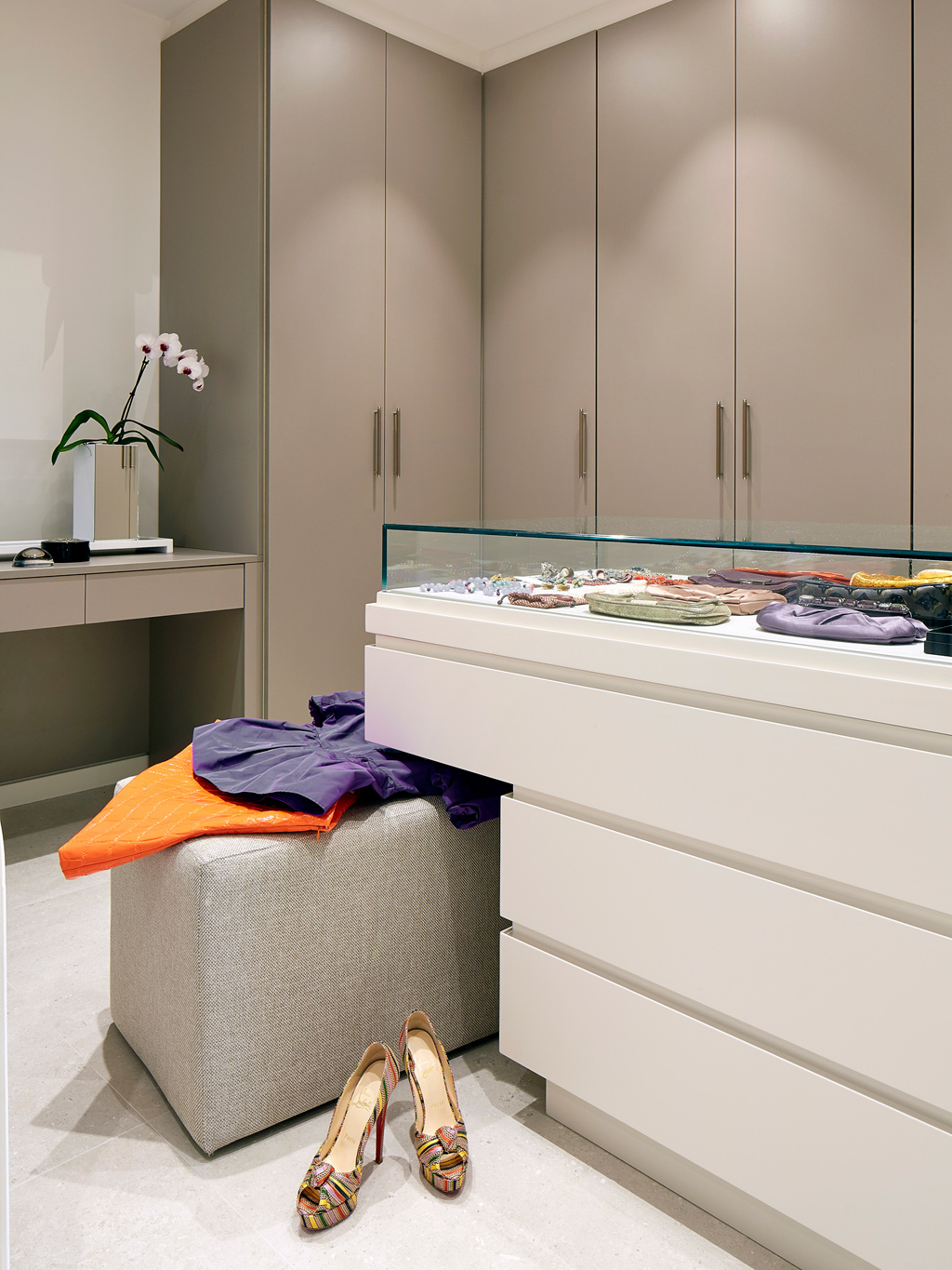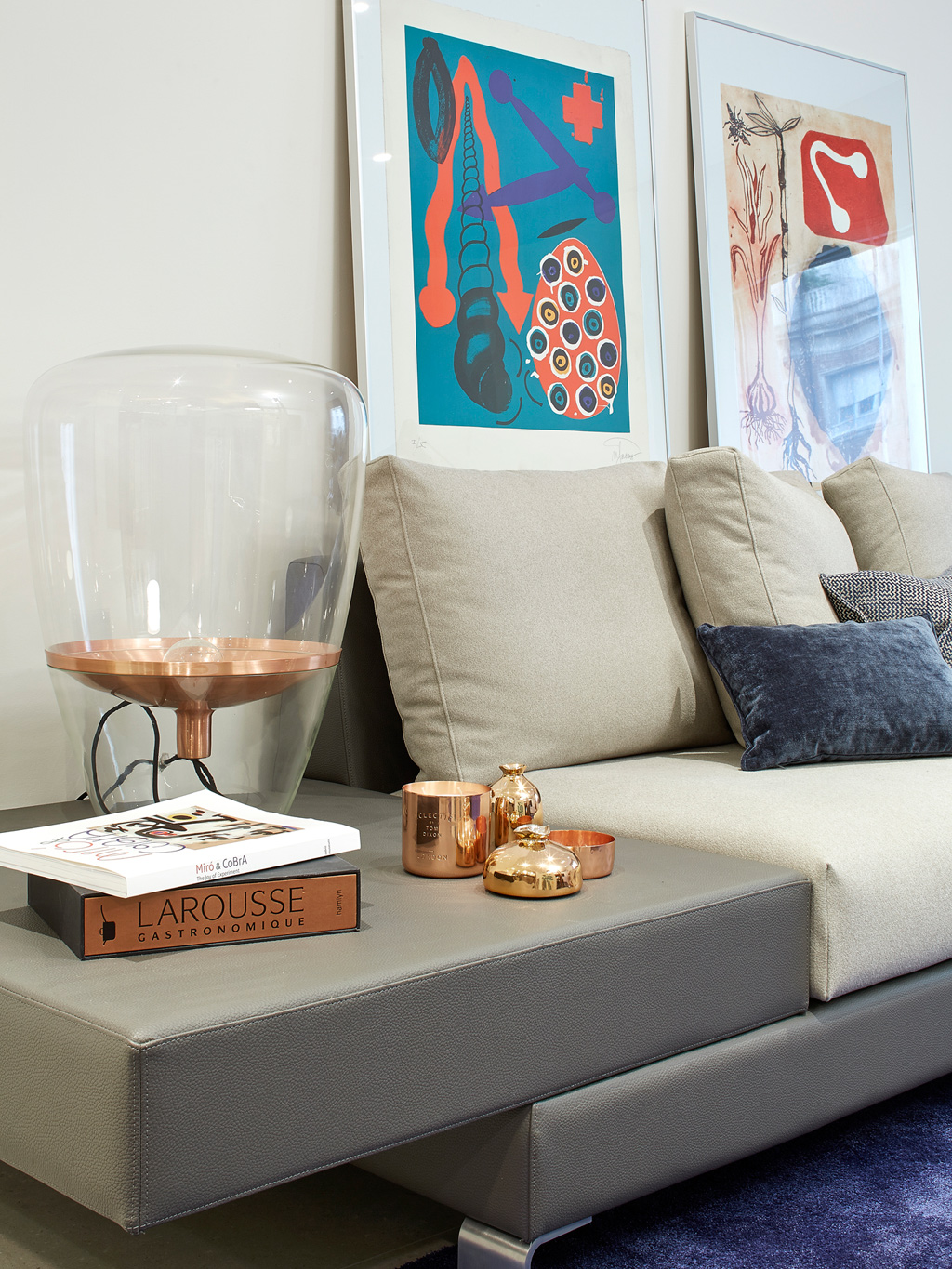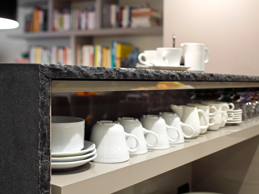 Egy nem túl nagy alapterű lakásban, megfelelő térszervezéssel nagyszerűen kialakítható a konyha, étkező, nappali hármas. A bútorok színe visszafogott, magasfűnyű, cappucino konyhafrontok, szürke és törtfehér kanapé. A kisebb méretű tárgyak már kaphatnak erősebb, bátrabb színt, mint a fekete étkezőszékek és mennyezeti lámpa vagy a kék szőnyeg.