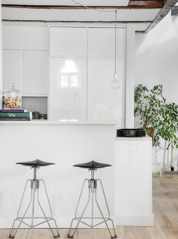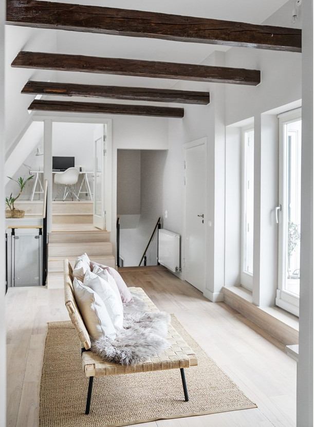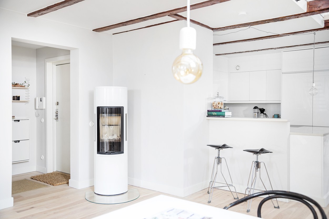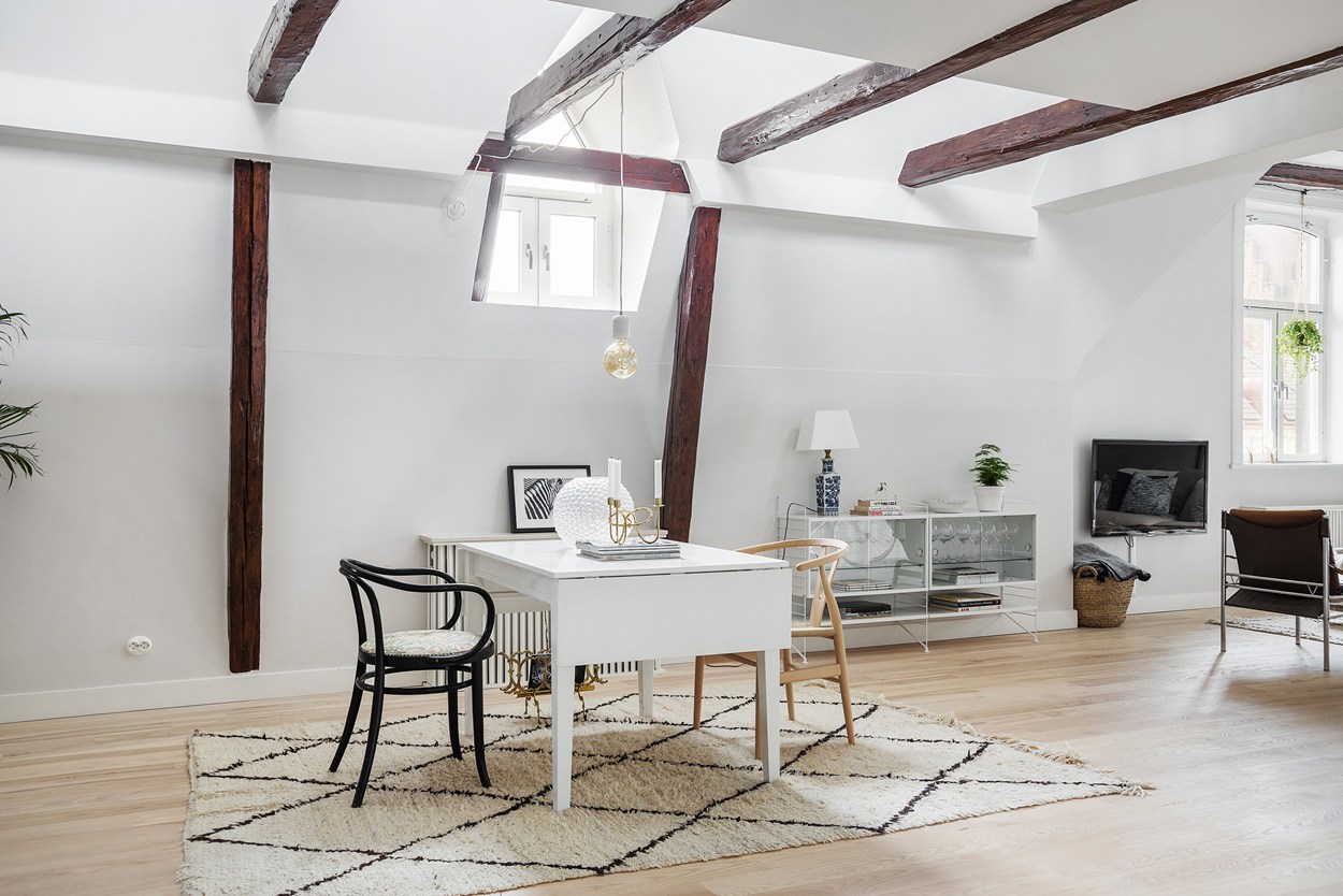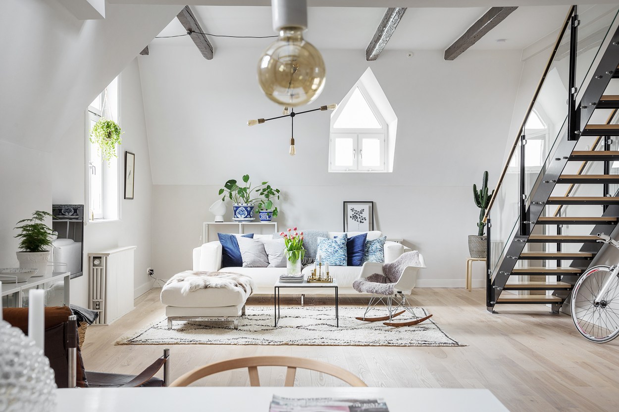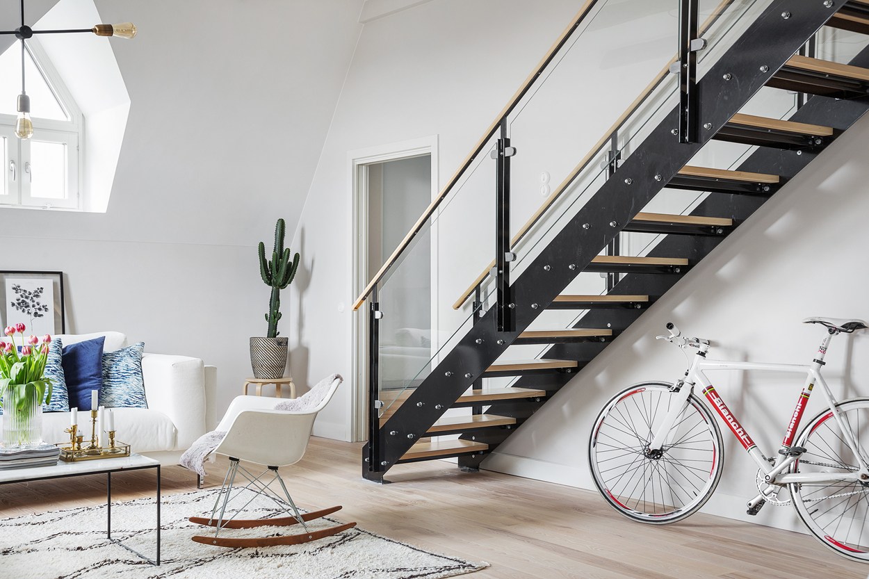 A ház, ahol ez az igencsak látványos lakás található, a 19. században épült Malmöben. Eredetileg a lakás fölött már csak a padlás volt, amit ügyes tervezéssel és átépítéssel idecsatoltak. A korabeli ablakmélyedések, a látszógerendák látványelemként jelennek meg az enteriőrökben. A stílus alapvetően modern és tagadthatatlanul skandináv, melyhez jól illenek az ipari jellegű kiegészítők. A padlástérhez sikerült egy apró kis tetőteraszt is kialakítani, mely - ha esik, ha fúj - a lakók kedvenc tartózkodási helye.