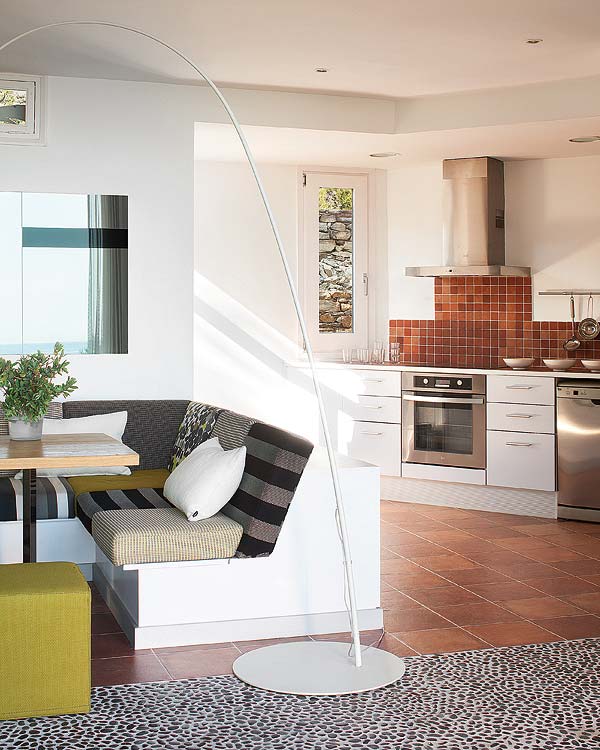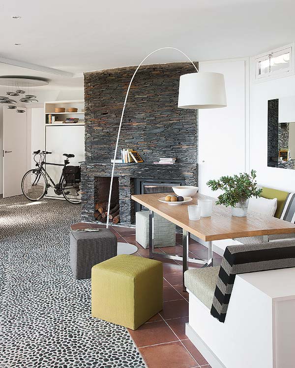 Ha egy nagyobb légterű lakásunk van, nagyszerű megoldás a hálót üvegfalakkal határoltan elválasztani. Éjszakára akár elhúzhatjuk a függönyöket, nappal viszont innen is árad a fény lakásunk többi részébe. Nem csak ez a megoldás zseniális ebben az otthonban, hanem a feketére festett téglafal is, a csodálatos fa bútorok és a vagány kékes zöld falszín, melyet az ajtók is megkaptak.