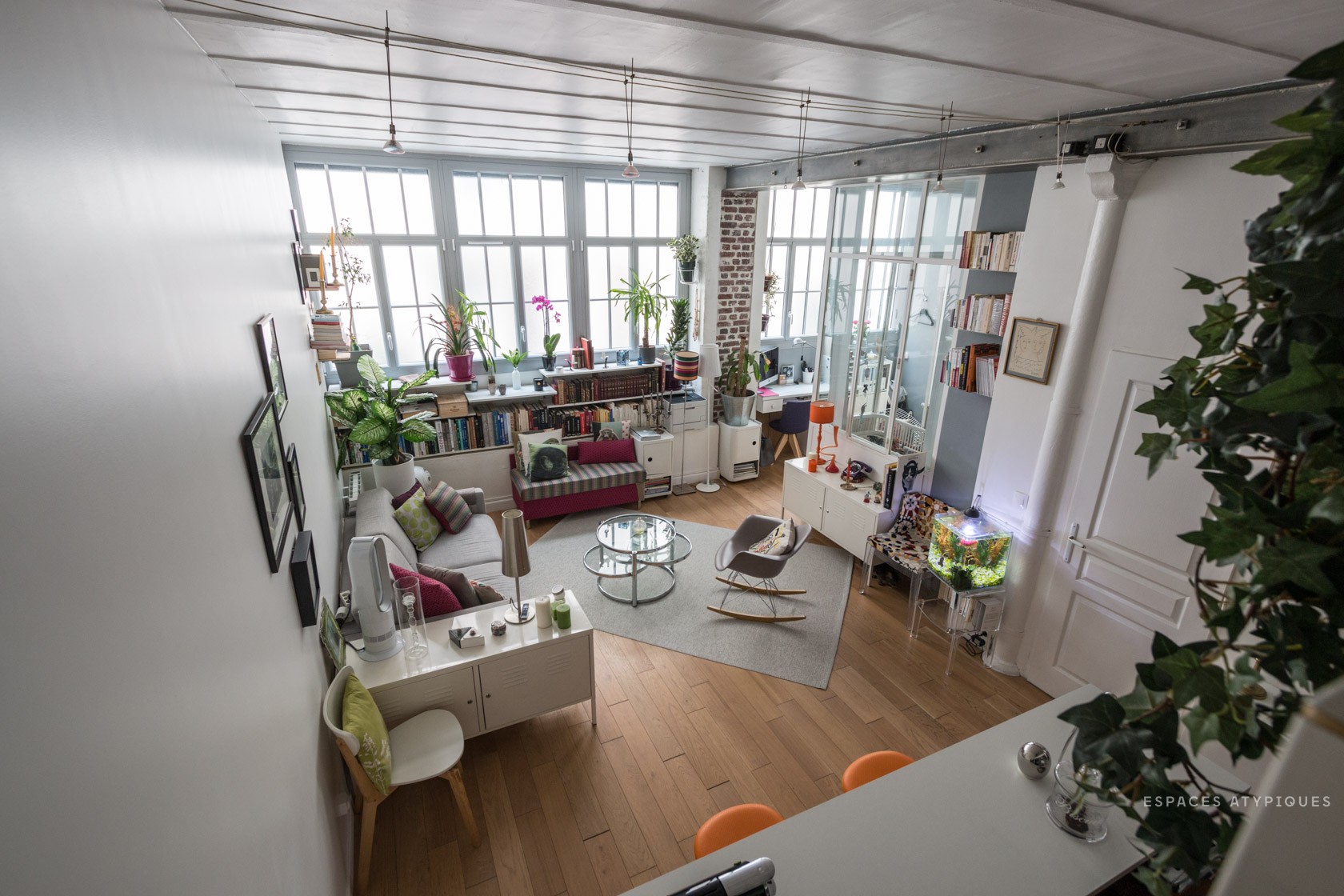 Okosan végiggondolt mini, loft lakás Párizsban. Sok, kis méretű, fehér tárolóbútort használnak. Az étkezőasztal egy gurulós, kinyitható darab, a fal mellé van tolva, csak vendégek érkezésekor használják, mivel a pultnál tudnak étkezni az itt lakók. A kisbabának egy helyes, igényesen berendezett része van. Ugyanott található a dolgozósarok is. A szülők a galérián alszanak, ahol szintén elhelyeztek fehér tárolóbútort is.
