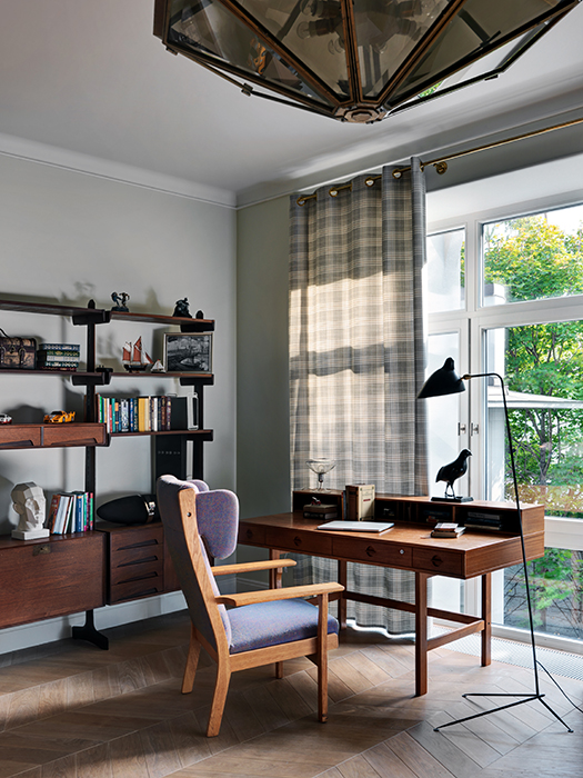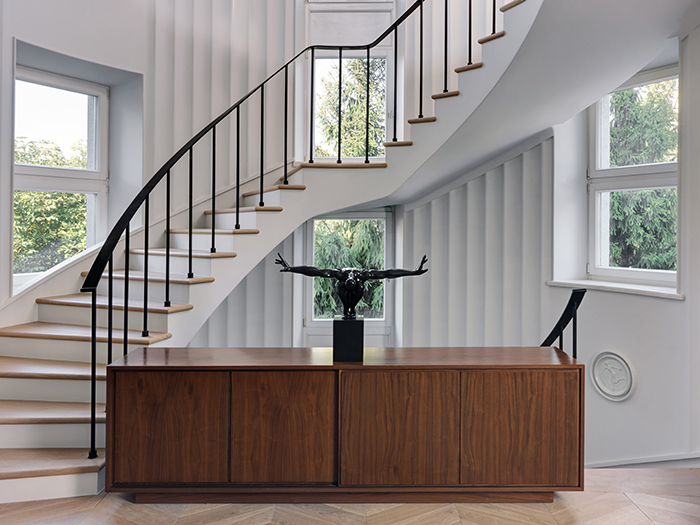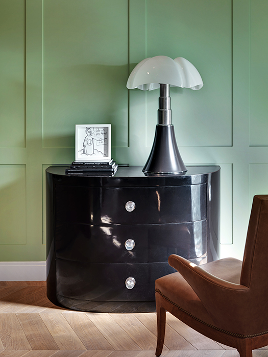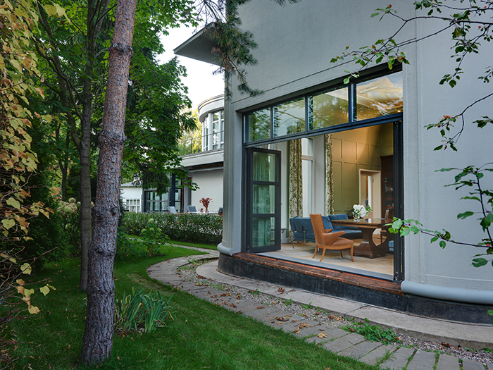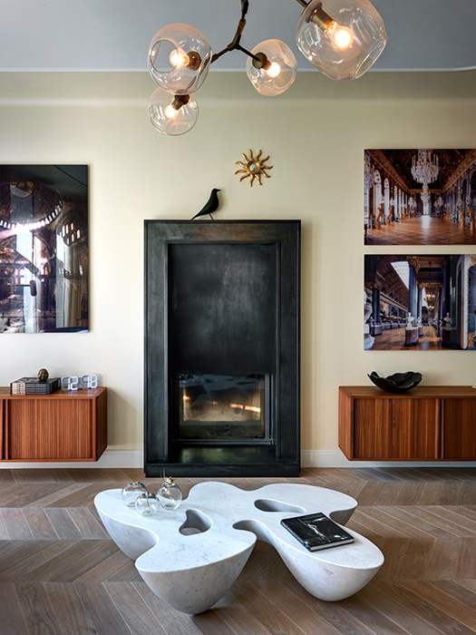 1960-as évek kortárs környezetben, röviden így is jellemezhetném ezt a nagyvonalú terekkel rendelkező 3 emeletes moszkvai házat. A ház tulajdonosa a konstruktivista stílust kedveli és gyűjtője az 1960-as évek design tárgyainak, bútorainak így kerültek egymás mellé például a modern halszálka mintás fapadló és a Mazzega Murano mennyezeti lámpa a nappaliban, a hexagon hidegburkolat a BassamFellows székek az étkezőben. Ha jól megnézzük a képeket mindenhol design „kincseket” találunk, akár eredeti vagy kevés másolat formájában. Igazi extravagancia, minimalista elvek alapján!