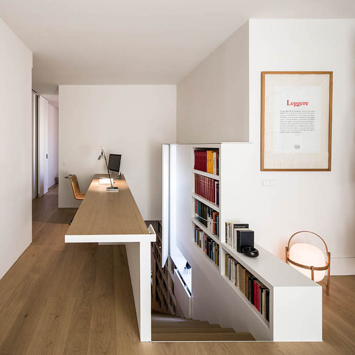 Szögletes geometriai formákkal és okos, praktikus térszervezéssel alakították ezt a duplex jellegű barcelonai otthont Francesc Rifé Stúdió építészei. A lakás kialakításánál a fő céljuk az volt, hogy az otthon tükrözze a tulajdonosok személyiségét és életmódját, ezért az enteriőrben a könyvek, a természetes anyagok, a fehér és a tölgyfa felületek játszák a fő szerepet, illetve minden belső tere fürdik a fényben. A maximális tér kihasználtságát elegáns módon szinte minimál egyszerűséggel, beépített bútorokkal, lengő lépcsőfokok és üvegfal kombinációjával, gipszkarton segítségével falba süllyesztett polcok kialakításával oldották meg.