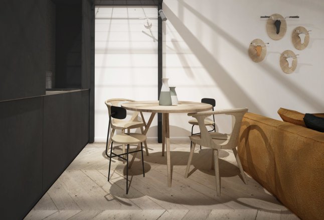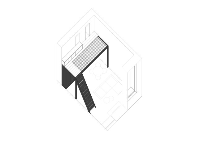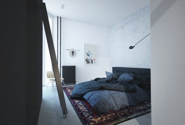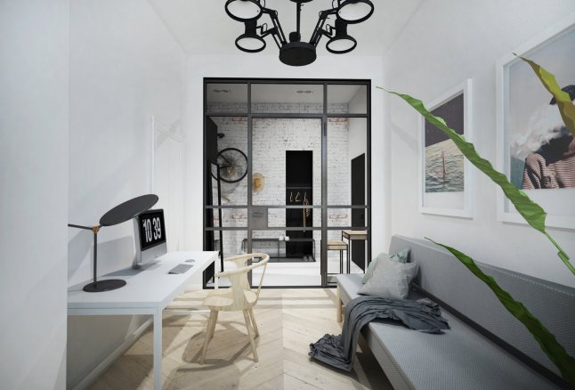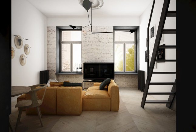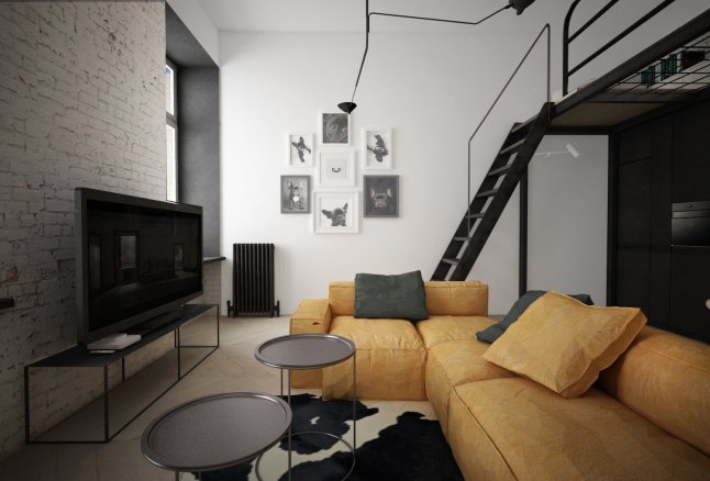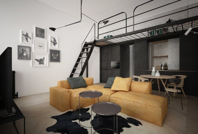 Egy cseppnyi garzon, melynek tulajdonosa mert nagyot álmodni. Annyira nagyot, hogy ebből a parányi lakásból loftos jellegű, a valóságosnál tágasabbnak tűnő otthont teremtett. A nagy belmagasságnak hála, semmi akadálya nem volt a galéria kialakításának. A szerkezet porfújt acélváz, mely jól illik a loftos környezetbe, ahogy a meszelt téglafal is ezt a hangulatot erősíti. A fekete-fehér párosítás az egész lakásra jellemző, csupán a kanapé mustársárgája töri meg a kontrasztot. Mindennek jutott hely: leválasztott hálófülke, tolóajtó mögé rejthető konyha egy térben a nappalival és az étkezővel, valamint dolgozó rész egy üvegfallal elválasztva.