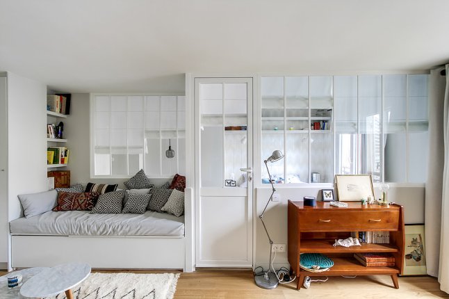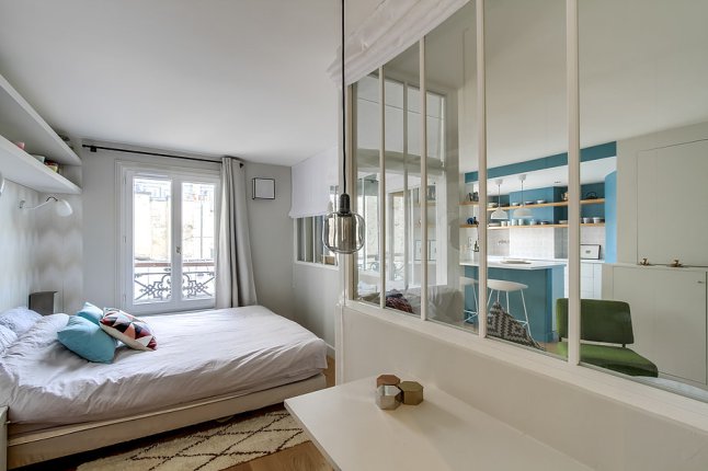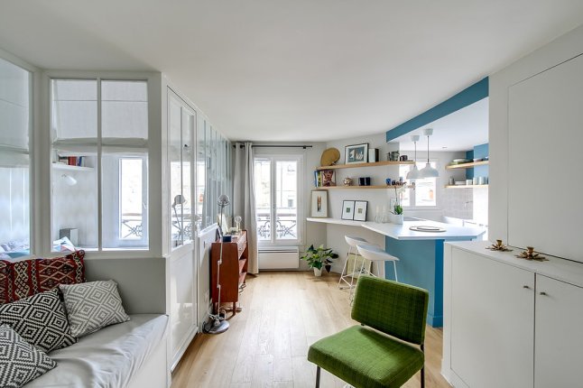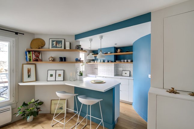 Ez a párizsi otthon egyáltalán nem tágas, de telis-tele van olyan megoldásokkal, melyet minden kis lakás tulajdonosának a figyelmébe ajánlanék. Adott volt tehát egy hagyományos beosztású és nagyon előnytelen alakú lakás: nappali, konyha, kamra, fürdőszoba. Az új tulajdonos aztán némileg átszabta a tereket. A kamrából lett a hálószoba, a nappali és konyha közötti falat kiütötték, csak egy része maradt, amin most az étkezőpult kapott helyet. A korábbi hálófülke helyére került a kanapé, alatta sok tárolóhellyel. A hálószoba - a régi sötét kamra - pedig egy üvegezett falat kapott a nappali felé, így fürdik a természetes fényben. A világosságot a sok fehér szín erősíti, a kék pedig üdeséget csempész a parányi enteriőrbe.