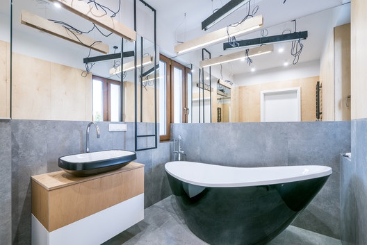 Kreatívságot és mai, modern design elemeket nem nélkülözve készült el ez a lakás. Fő színei a fekete, fehér és a szürke, melyekhez igazán jól passzol a beton és a fa is. A fürdőszoba kialakítása külön említésre méltól. Csodás szabadon álló kádja mi más lehetne, mint fekete színű darab. :-)