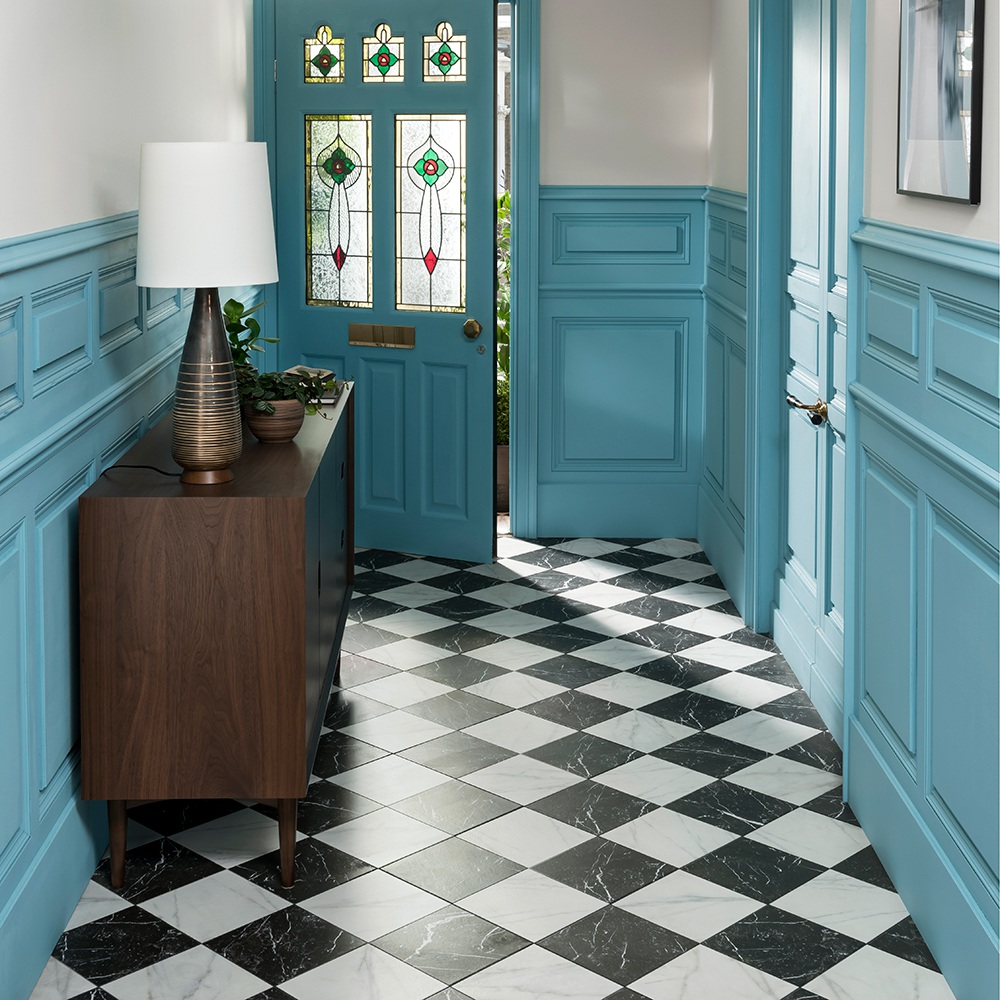 Végül az előszobát feldobja a fekete-fehér kockás padló, ami soha nem megy ki a divatból, az egységes kék ajtók és falburkolat különleges hangulatot árasztanak.