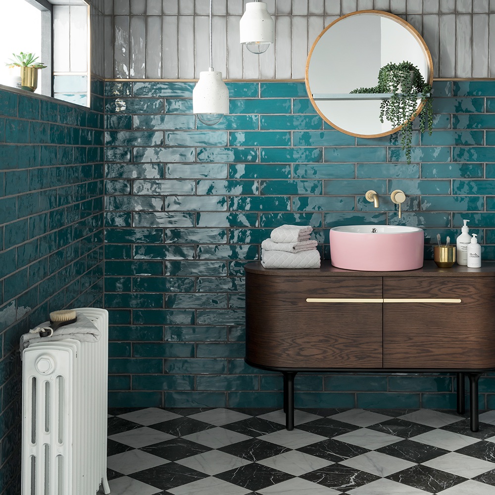 Az art-deco fürdőt teljesen megváltoztatja a páva-kék csillogó mázas csempe, merész és lenyűgöző. A rózsaszín mosdóval eléggé dekadens lesz, ugye?