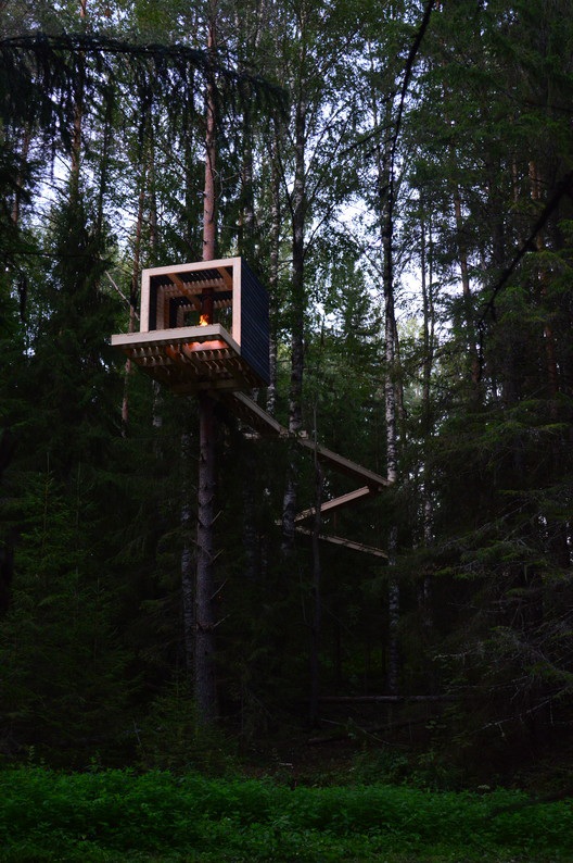 A kocka menedékház egy fenyőfa köré épült. Fönt találni egy tűzrakó helyet és csodás panoráma nyílik a naplementére is. A kis házhoz egy 36 m hosszú emelkedő, kanyargós rámpa vezet fel. A rámpa kanyargásával az erdei utak jellegzetes vonulatát szerették volna meghosszabbítani a házig.