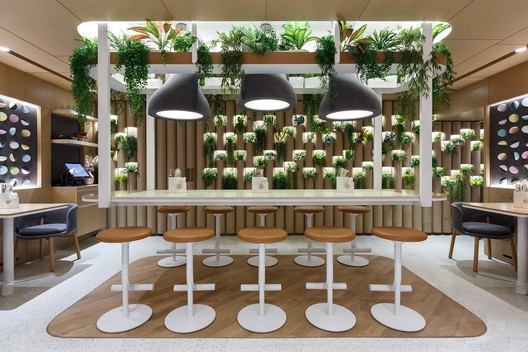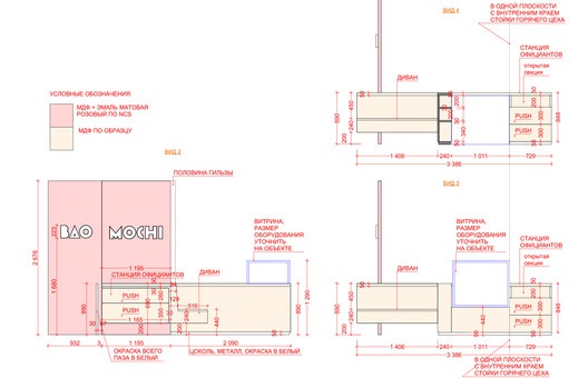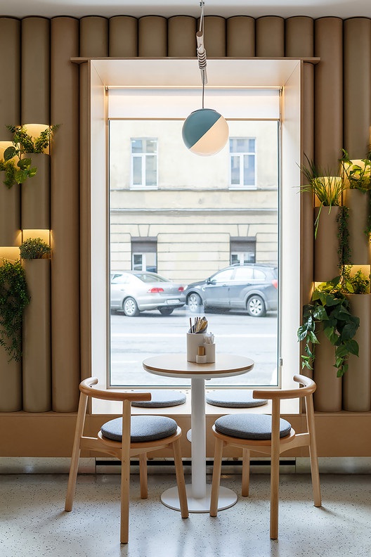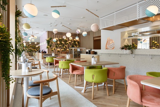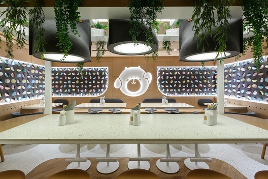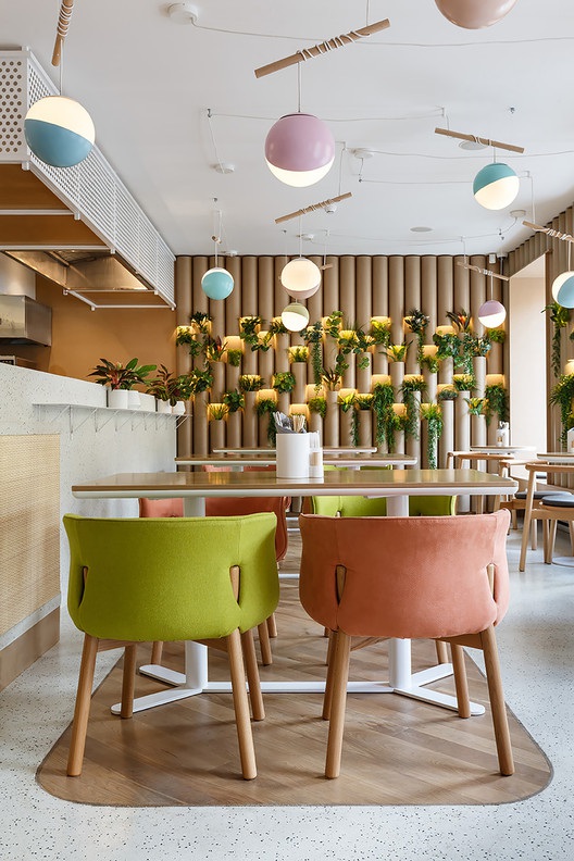 Az oroszországi étterem japán gőzgombócot szolgál. Ennek nyomán a tervezők a Marat Mazurtól olyan belső teret terveztek, ami minden ízében a gőzgombócokra emlékeztet. Remek lámpákat sikerült párosítani a japán stílusú székekhez, és a félgömbökbő álló háttérhez. Ezen felül izgalmasak a színek, a térelválasztóként funkcionáló padlószigetek, a megvilágított, növényekkel teli hátfal és a logó megviágítása is.