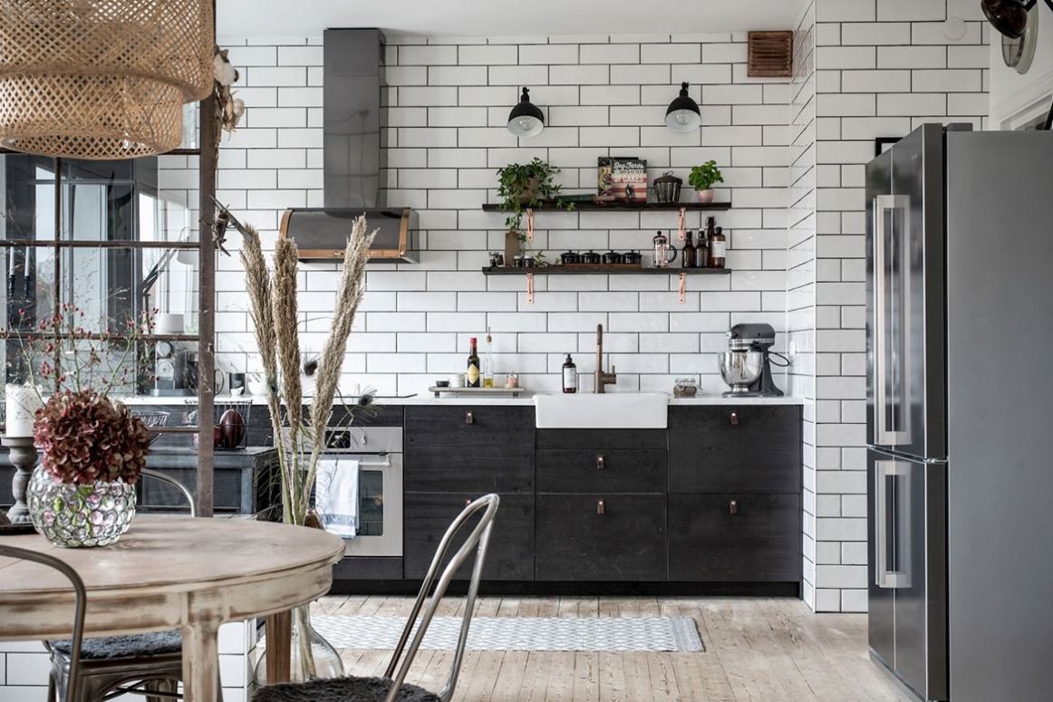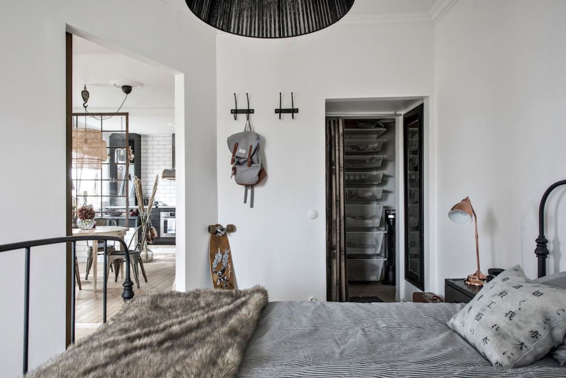 Ez a svéd lakosztály egyedülálló részletekkel, elemekkel hívja fel magára a figyelmet. Mindegyiknek saját története van. Az ipari típusú ablakok, amelyek elválasztják a konyhát a nappalitól, egy lengyel gyárból származnak, míg a régi ajtókra Dániában találtak rá. A régi kor ütött-kopottas tárgyai sorra visszaköszönnek a mai enteriőrökben. Mindez ötvöződik egy klasszikus, időtlen, tökéletesen eklektikus belső térben. Itt fellelhető minden, ami a különbőző stílusokat jelképezi. A loft, a vintage, de akár a country stílusjegyeit is beleképzelhetjük. Ha mindez nem elég, a fehér-fekete dominancia a monokróm életérzést erősíti bennünk.