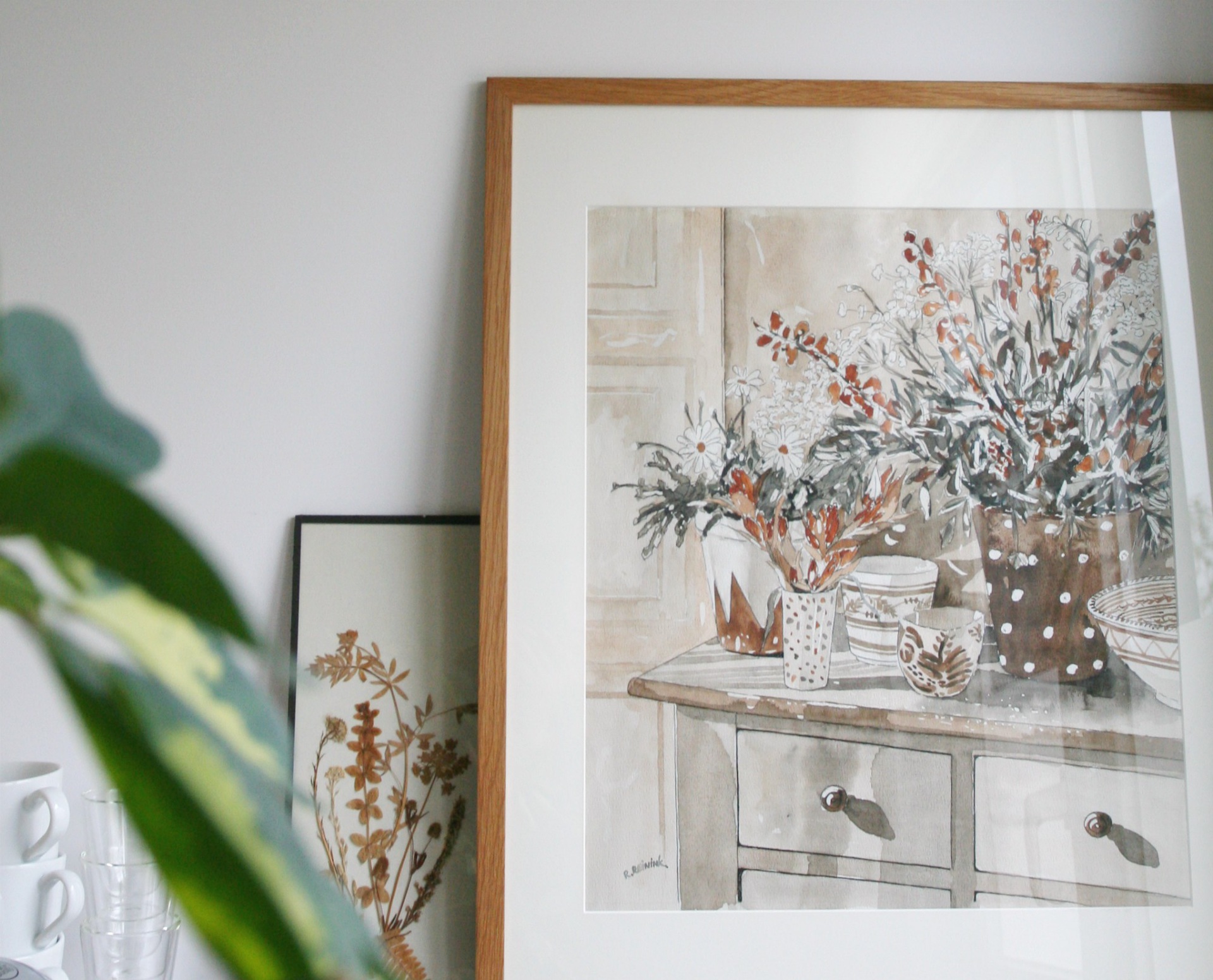 A következő jól bevált klasszikus a váza kompozíció festménnyel kombinálva. Rendkívül jól mutat minden otthonban, akár különböző vázákkal is. Festmény helyett pedig akár egy nagyobb tükröt is használhatunk letámasztva.