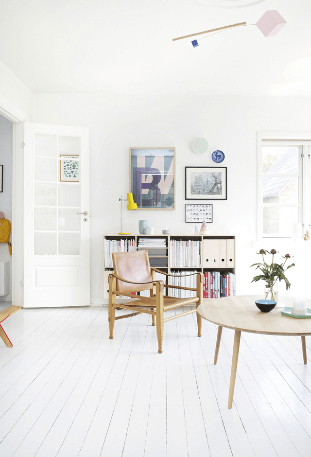 Egy kis dán városban, Hedensted-ben található skandináv stílusú ház, amelyet igazi városi eklektika jellemez. Fagylat színek semleges fehér alapon: kék, rózsaszín, lila színek, amiket elhintve megtalálunk a kiegészítőkön, bútoron, textileken. A padló, falak, nyílászárók sok fehérjét ellensúlyozzák a világos fa bútorok, mint az IKEA EKBY Gallo polcrendszer, bolhapiaci leletek és egy-két design klasszikus.