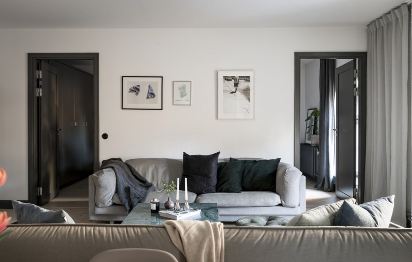 A nappali két kanapéja sem egyforma, az egyik a konyhával, a másik az étkezővel harmonizál.
