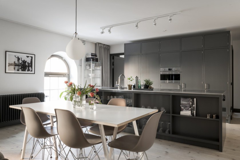 A konyhában jó példát láthatunk arra, hogyan lehet összeolvasztani egy szigetet a mellette lévő étkezővel és nappalival. Nem csak tálalásra alkalmas a polc, de könyveket vagy képeket is bele lehet állítani. Ötletes.