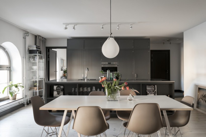Az étkező világos és a székek nyers színe jól kompenzálja a sötét konyhát.
