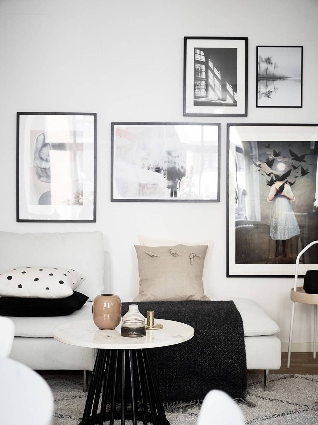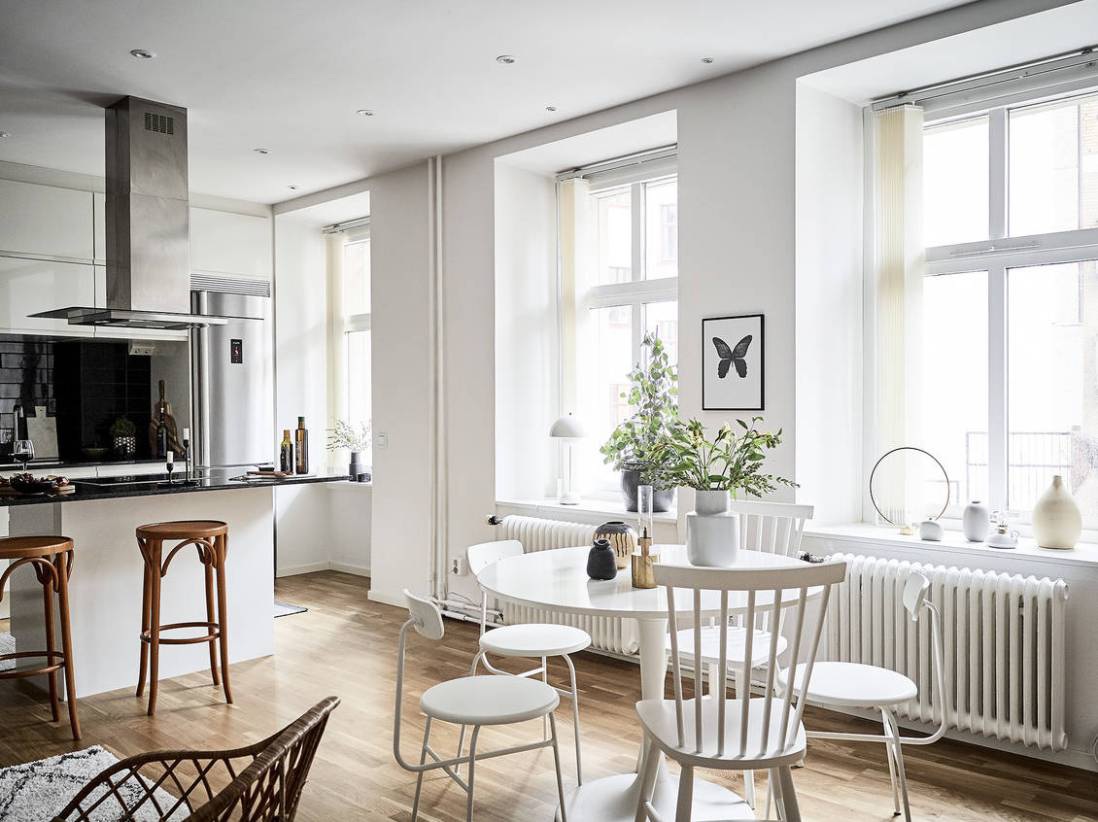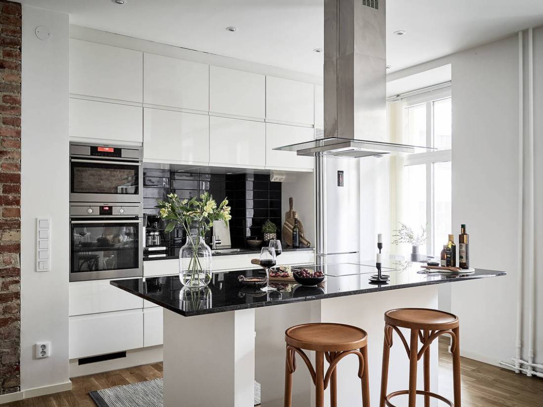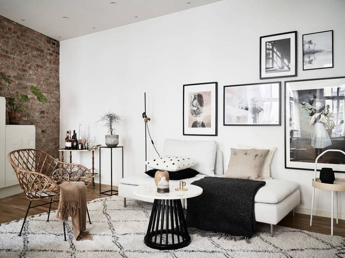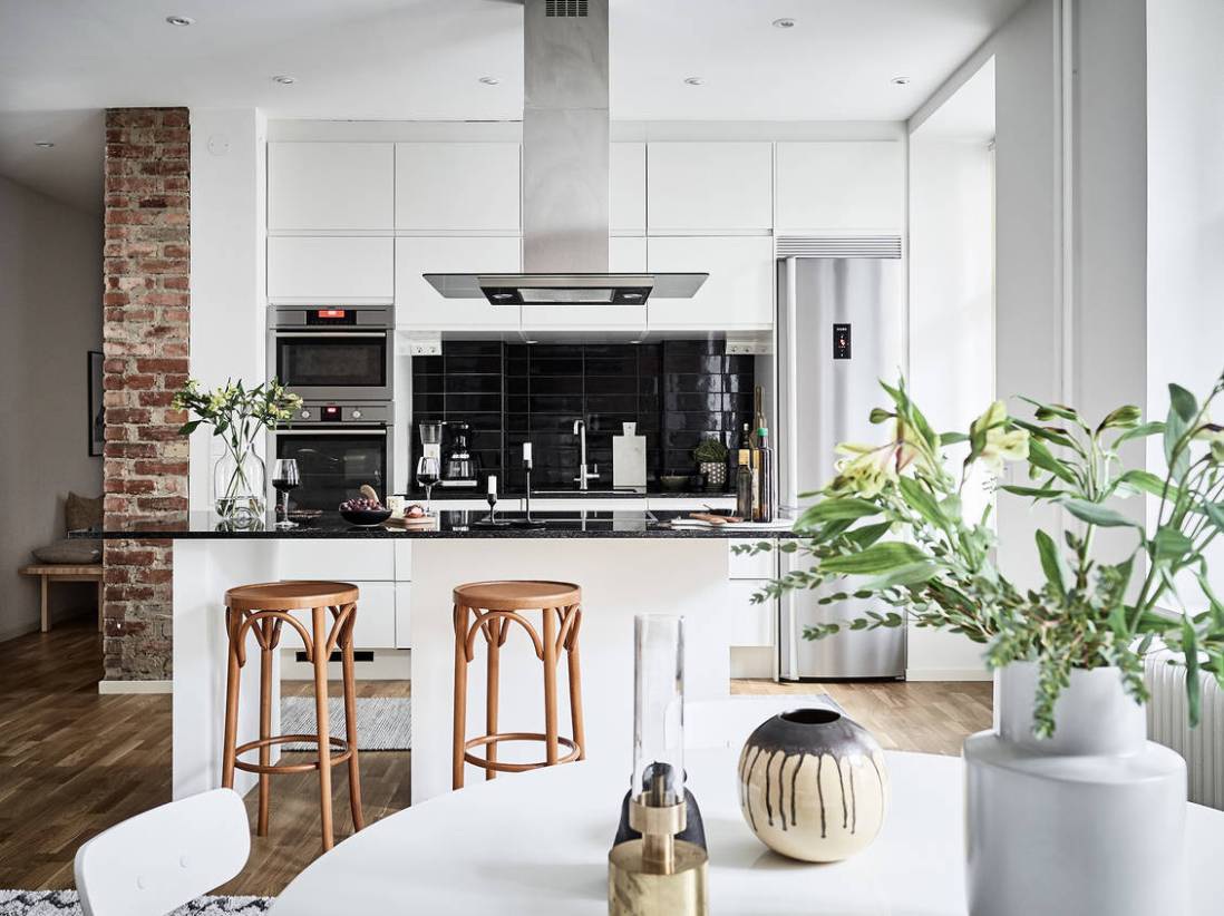 Eredetileg kétszobás lakásból egyterű nappali-étkező és egy hálószoba készült, a régi lakás felújításakor lebontották a nappali és a konyha közötti falat. Rengeteg időt szántak a régi téglafal megfelelő kezelésére, ez a nyers fal lett a lakás különlegessége. Visszafogott fekete-fehér és a tégla határozza meg a hangulatot, a tágas, világos régi lakás a felújítás után igazán kellemes és főleg a konyha - látványosan modern lett.