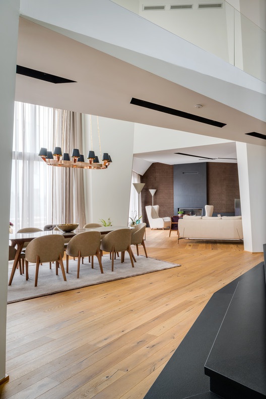 A ház geometrikus formavilágát ellensúlyozza az étkezőszékek és függőlámpák organikus alakja. A harmonikus enteriőr létrehozásában a hideg szürke falak és szőnyeg, valamint a melegszínű fa anyagok váltakozása játszik szerepet.