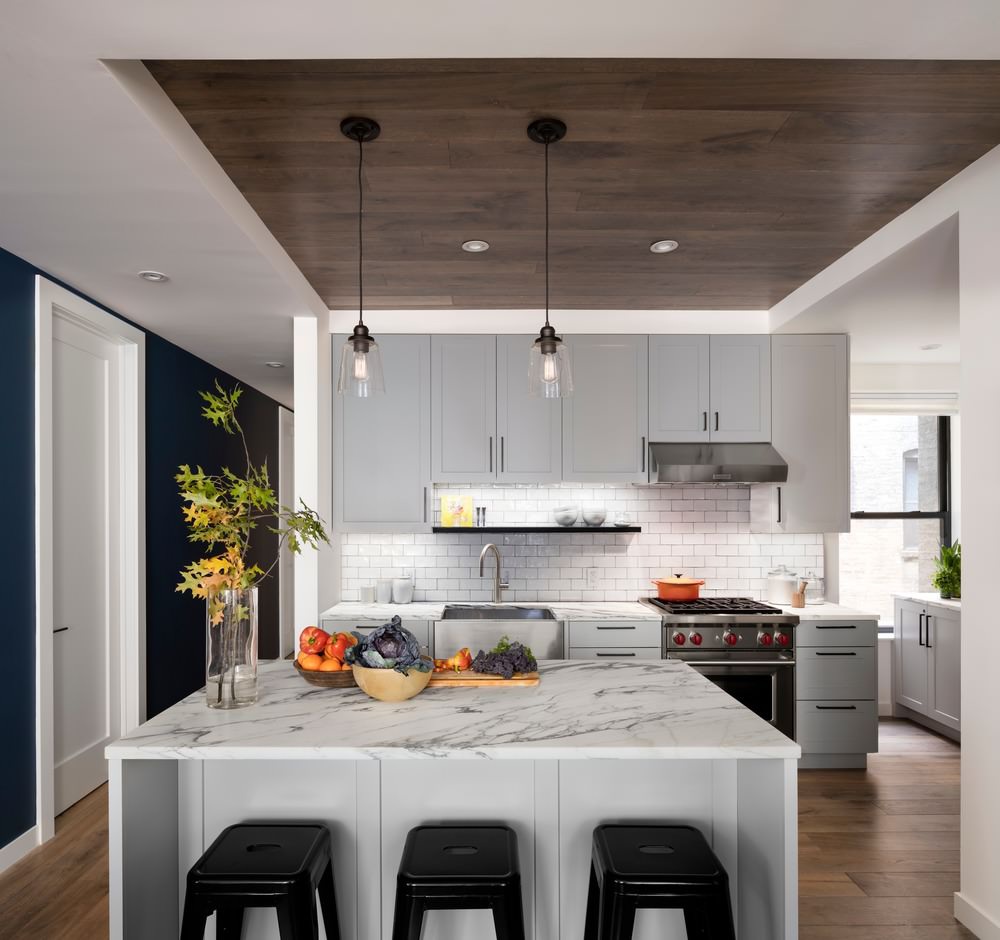 Tovább színesíthetjük léptetett álmennyezettel és rejtett, süllyesztett világítással, mint azt az első képen is látjuk a konyhánál.