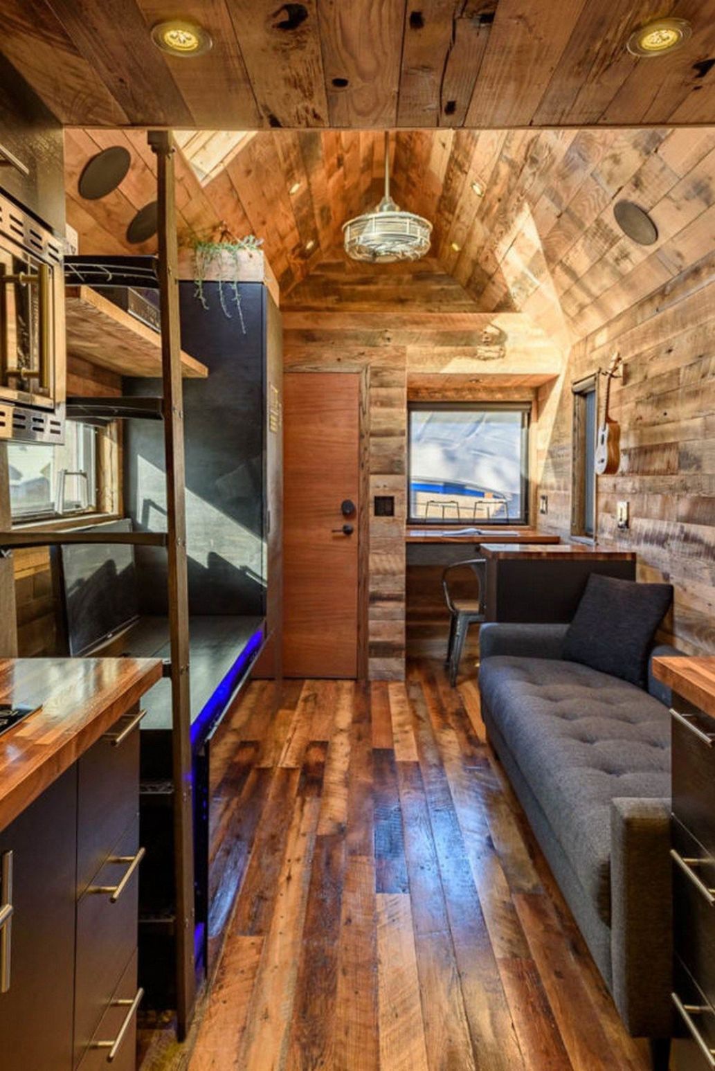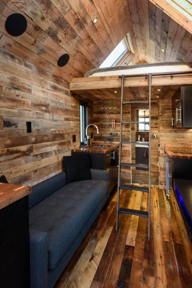 Karakteres, modern, mégsem minimalista. Üdítően más, mint a megszokott faházak. A konyha kicsinysége nem zavar semmit, minden funkció tökéletesen megvan benne és el is lehet férni. A fürdőszoba is kényelmes méretű. A hálószoba igazi kedvenc, ha valaki szeret a szabad ég alatt aludni. Az ide vezető, eltolható létra kifejezetten praktikus. Még egy íróasztal is elfért, és még mindig 16 négyzetméterről beszélünk.
