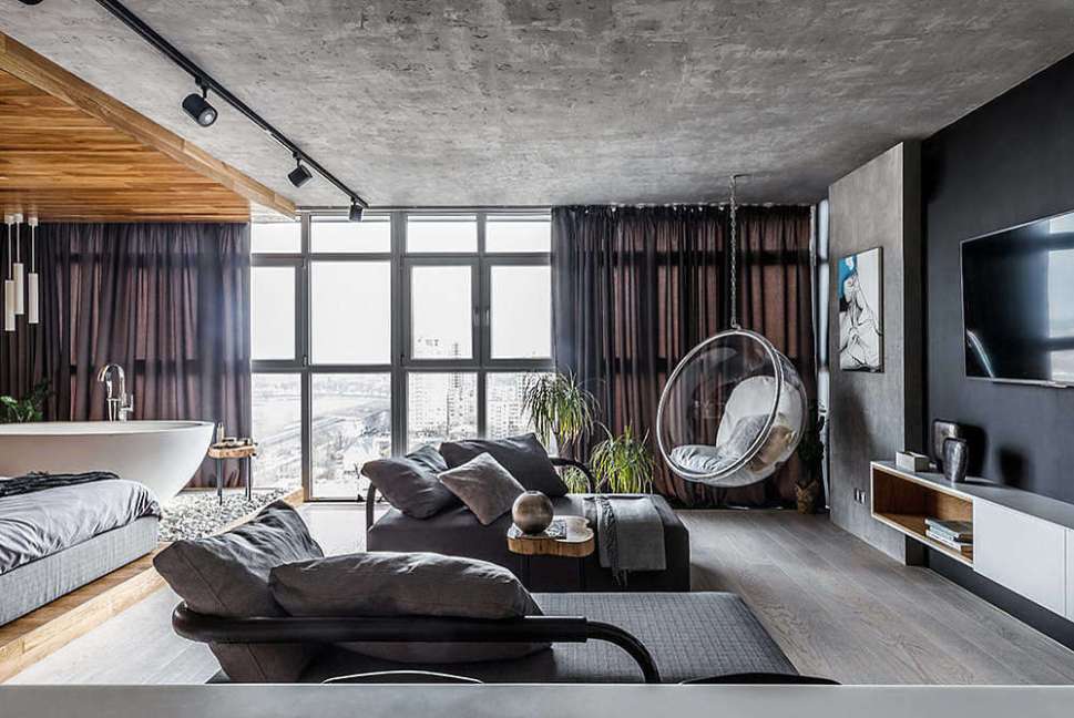 Ebben a lakásban hiába került a legtöbb funkció egy térben, mégis remekül szeparáltak a funkciókat a dobogó és a burkolat váltás segítségével. A klasszikus fehér mennyezetet látszó betonnal váltották ki, ami még a falra is lefut. A beton ridegségét a természetes fa melegségével ellensúlyozták.