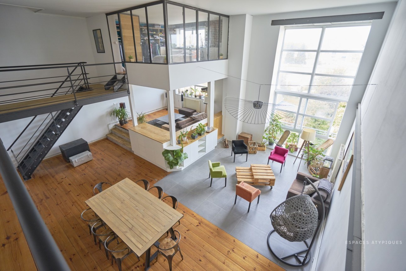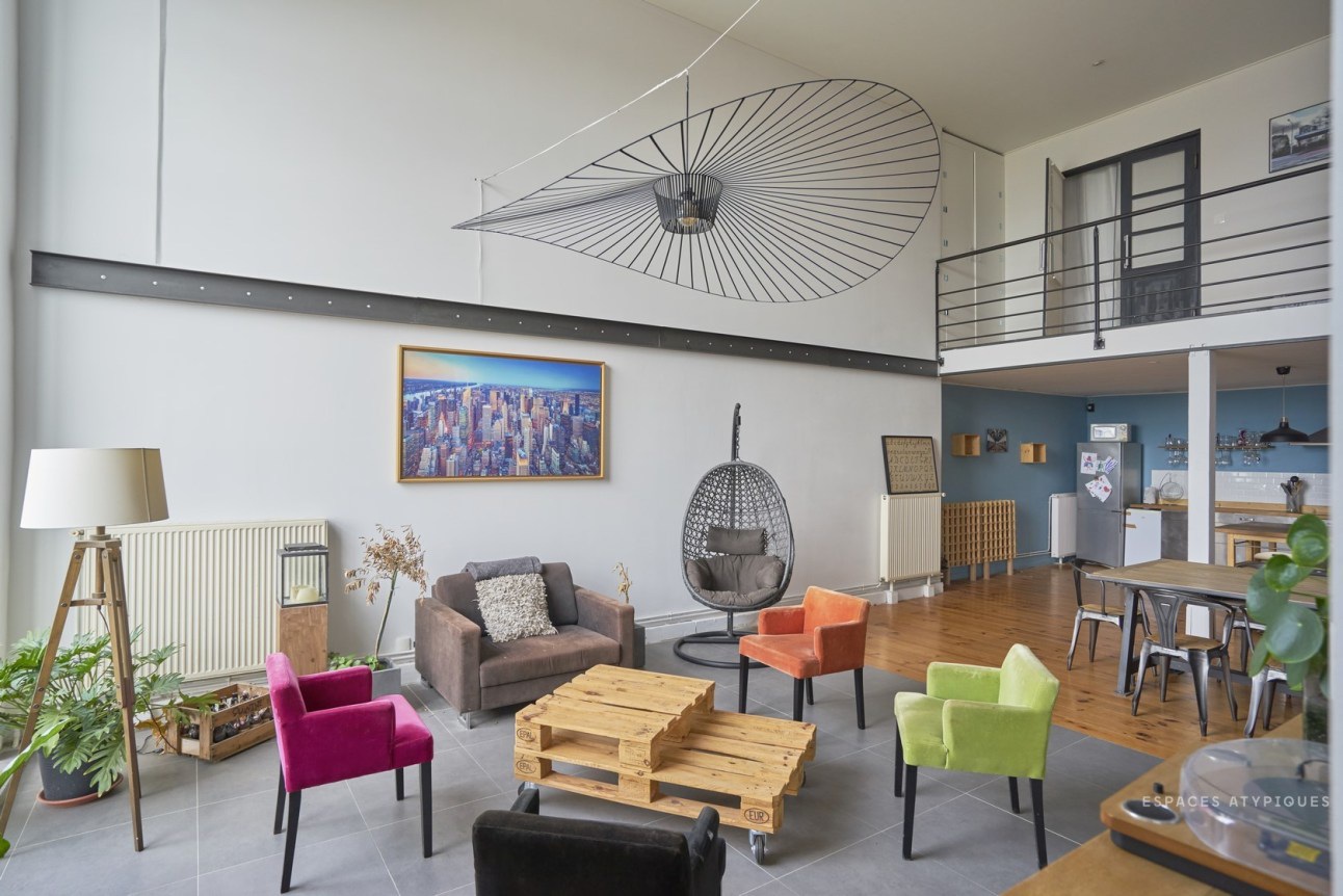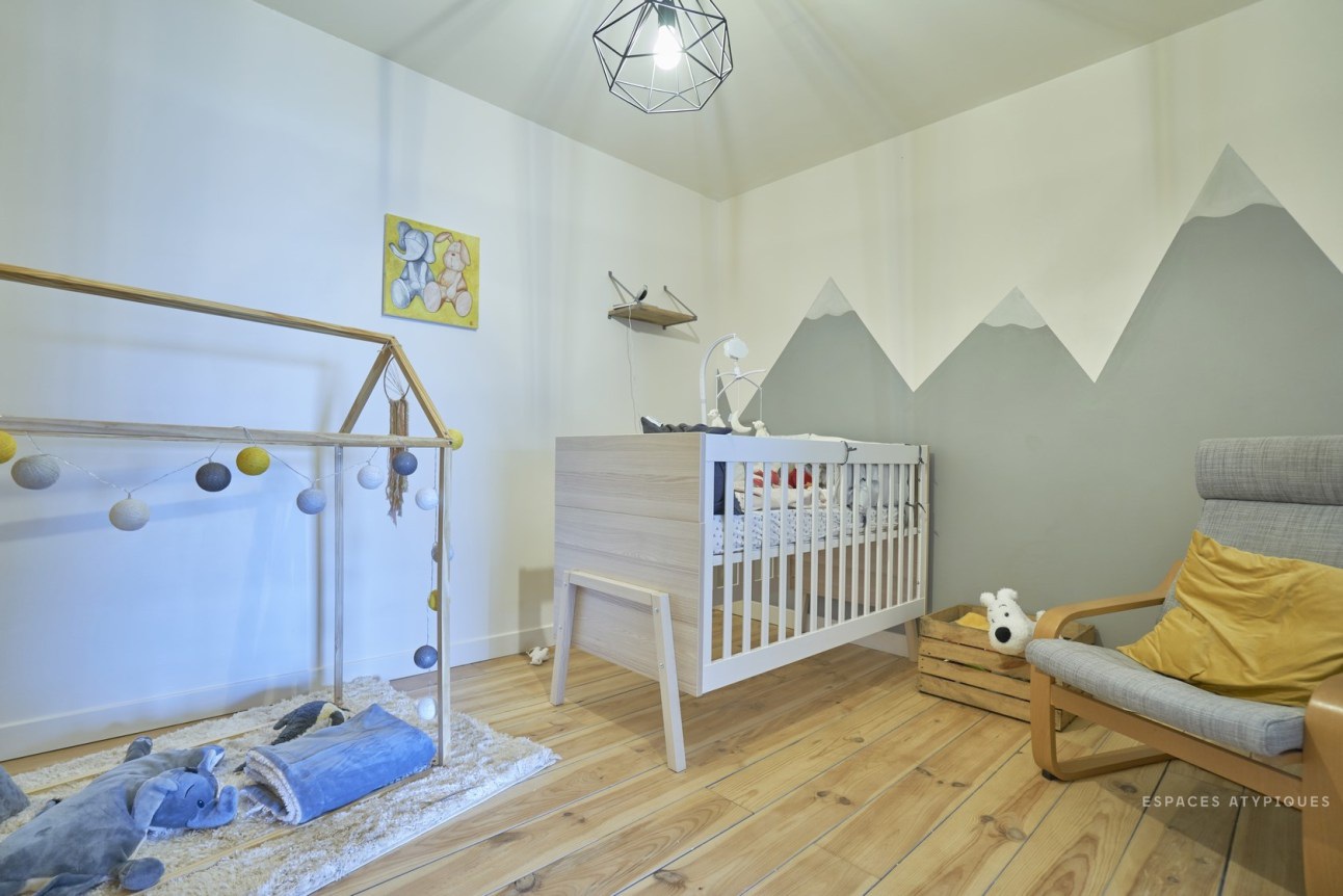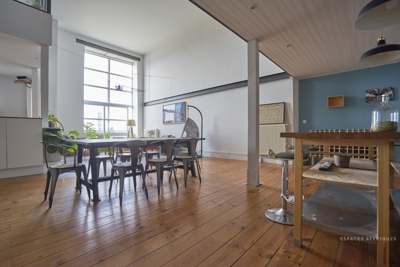 A nagy belmagasság nagyon impozáns hatást kelt, de sok esetben tűnhet tőle a tér kihasználatlannak. Ezért érdemes néha kicsit csalni optikailag: itt a vízszintes dekor csíkkal, és a falról merevített lámpával érték el ezt.