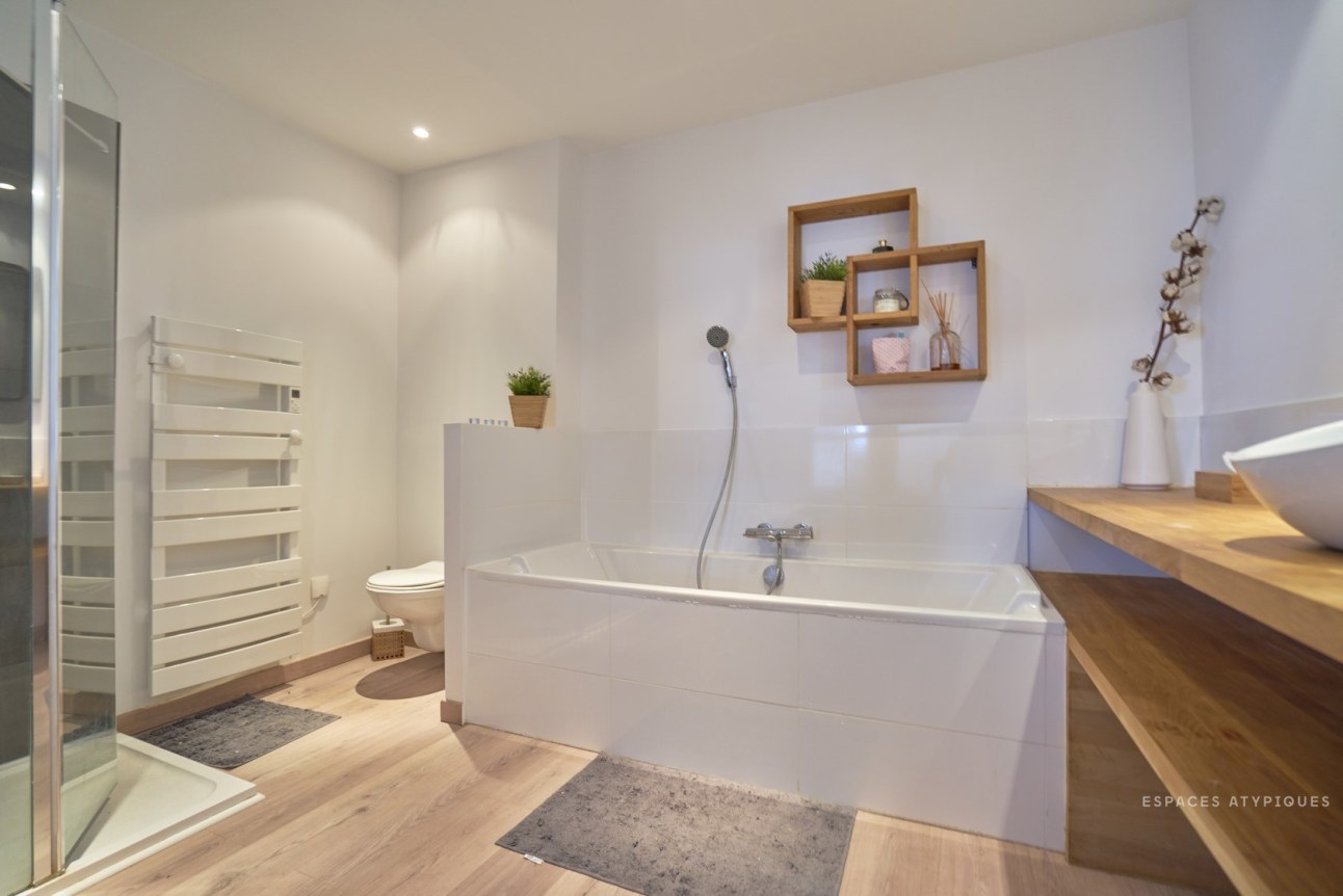 A fürdőszobában is visszaköszön a meleg hatású fa anyag, kevés fehér csempével kombinálva. Jól példázva, hogy nem szükséges minden falat teljesen burkolni.
