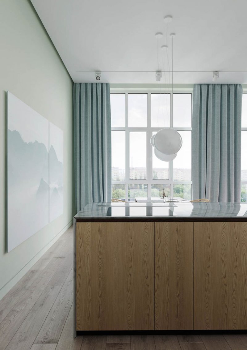 Ebben a nappaliban nem a szokványos színkombinációkkal találkozhatunk. Bár minden főbb bútor elem színes, mégis nagyon letisztult hatást kelt a pasztell színeknek köszönhetően. Az óriási ablakok által biztosított nagy mennyiségű fény még inkább derűssé teszi az összhatást. A natúr fa padló remekül passzol ehhez az üdítő színfolthoz. Ha ez nem lenne elég, érdemes még egy pillantást vetni a konyhára, ahol fényes márvány felület, natúr fa és matt fehér anyagok triója keveredik egy izgalmas konyhasziget-étkező asztal összekapcsolásban. Az asztal felett pedig felhőként lebegő függesztett lámpa világítja meg a vacsorákat.